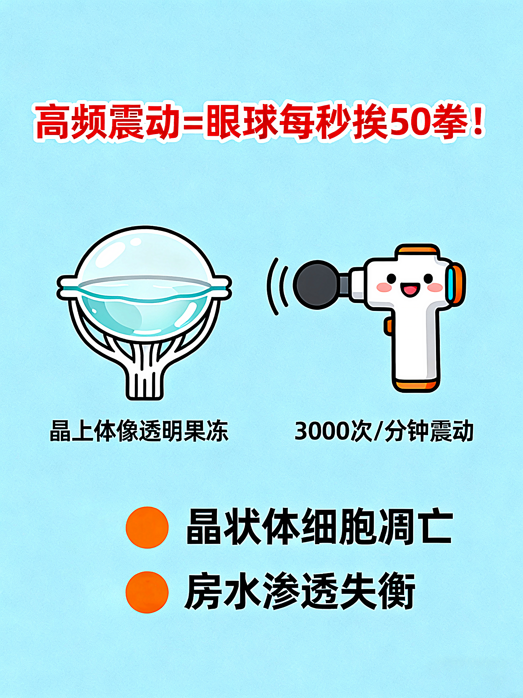 眼球内的晶状体就像一块透明果冻,周围悬韧带固定它。筋膜枪每分钟3000次震动,相当于让眼球每秒挨50拳!这种暴力冲击会直接引发两个问题:
