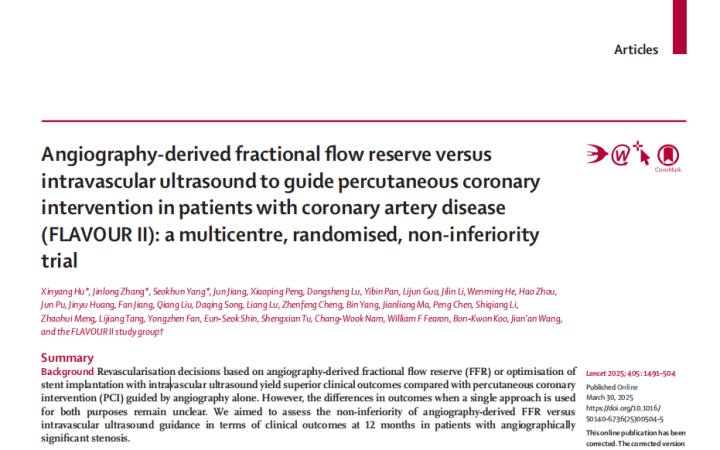 近期,由王建安院士、胡新央教授领衔的FLAVOURⅡ研究成果,在美国心脏病学会年会与《柳叶刀》杂志同步公布。该研究证实,AI赋能的QFR技术,在指导冠心病介入治疗方面的临床疗效可媲美传统血管内超声技术,且仅需单一体位影像,1分钟内就能完成全流程分析,诊断效率实现质的飞跃。