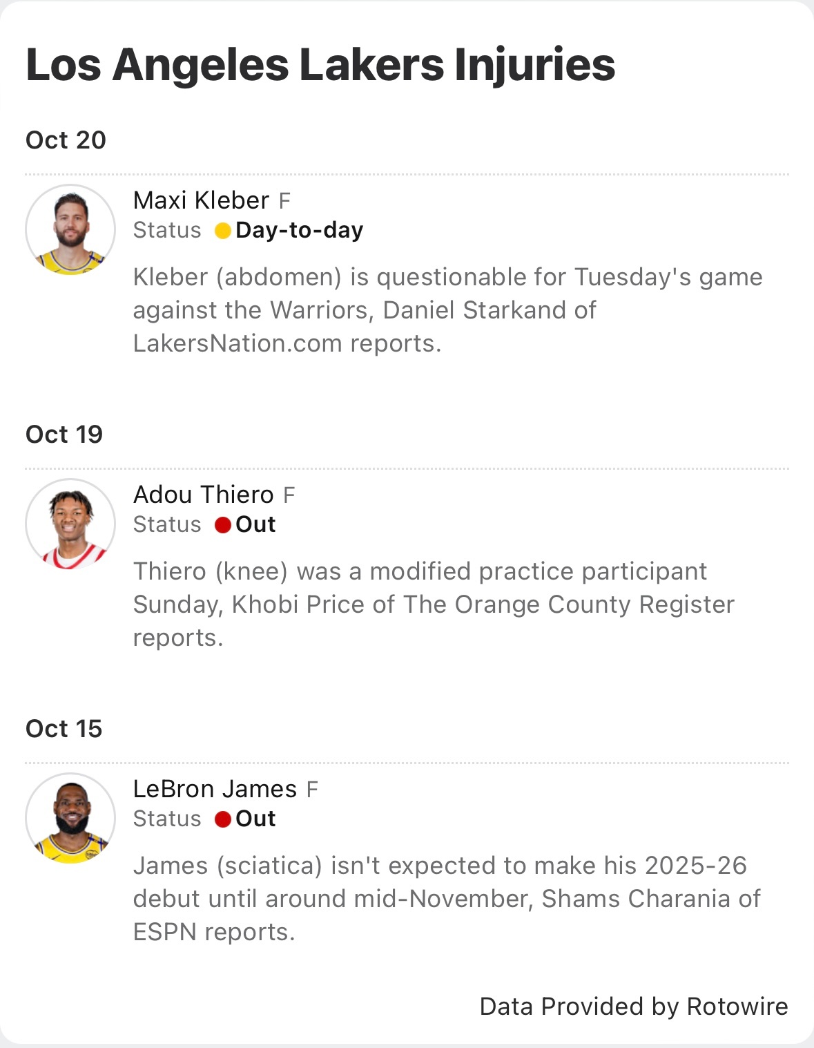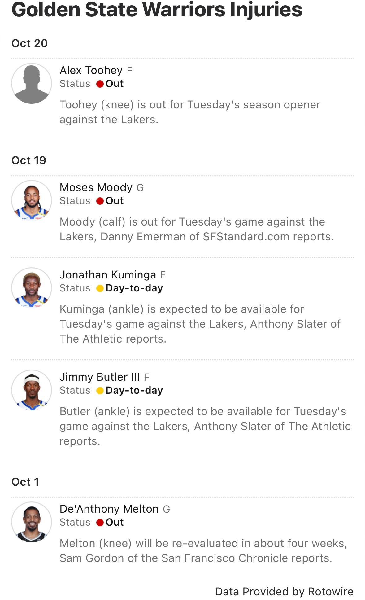 伤病报告:勇士穆迪缺席比赛,巴特勒、库明加预计出战。湖人克莱伯出战成疑,詹姆斯、蒂耶罗缺席比赛。