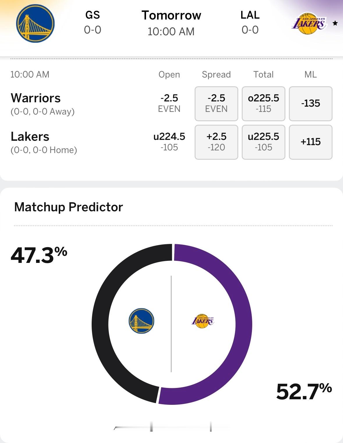 新赛季重启征程! 湖人明日揭幕战主场10点对阵勇士,ESPN给出获胜概率:勇士47.3%、湖人52.7%。勇士蓝色队服,湖人黄色队服。