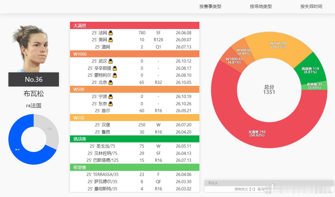 布瓦松赛季提前报销 看看“偏科生”布瓦松今年1351分的积分构成,几乎都是红土!其中大满贯792分!
