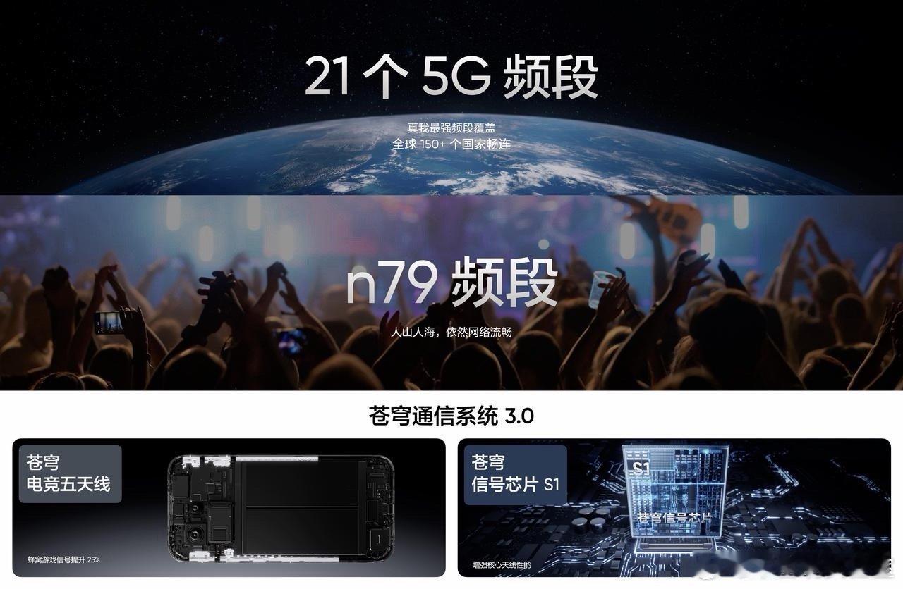 -首发苍穹信号芯片 S1,弱网打游戏也能快人一步,更有真我最强频段覆盖,支持n79 频段在内的21个5G频段,全球畅连信号无忧