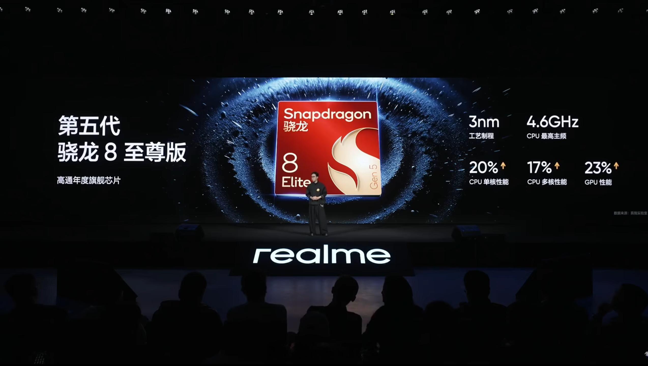 老熟人啊,真我 GT8 Pro 搭载骁龙 8 Elite Gen5 移动平台,LPDDR5X 内存,UFS 4.1 闪存,7000mm² 超覆盖冷锋 VC 散热,电竞独显芯片 R1,首发苍穹信号芯片 S1,GT 性能引擎 3.0。