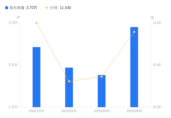 日期A股户数(户)流通A股户均持股数(股)户均持股市值(万元)2025-09-30370118281.639.472025-06-30313169787.6910.362025-03-31322019518.699.992024-12-31346338850.2710.272024-09-30350688740.499.252024-06-30353668666.847.432024-03-31362008464.498.572023-12-31389307910.539.222023-09-30432797117.868.542023-06-30393047837.729.55