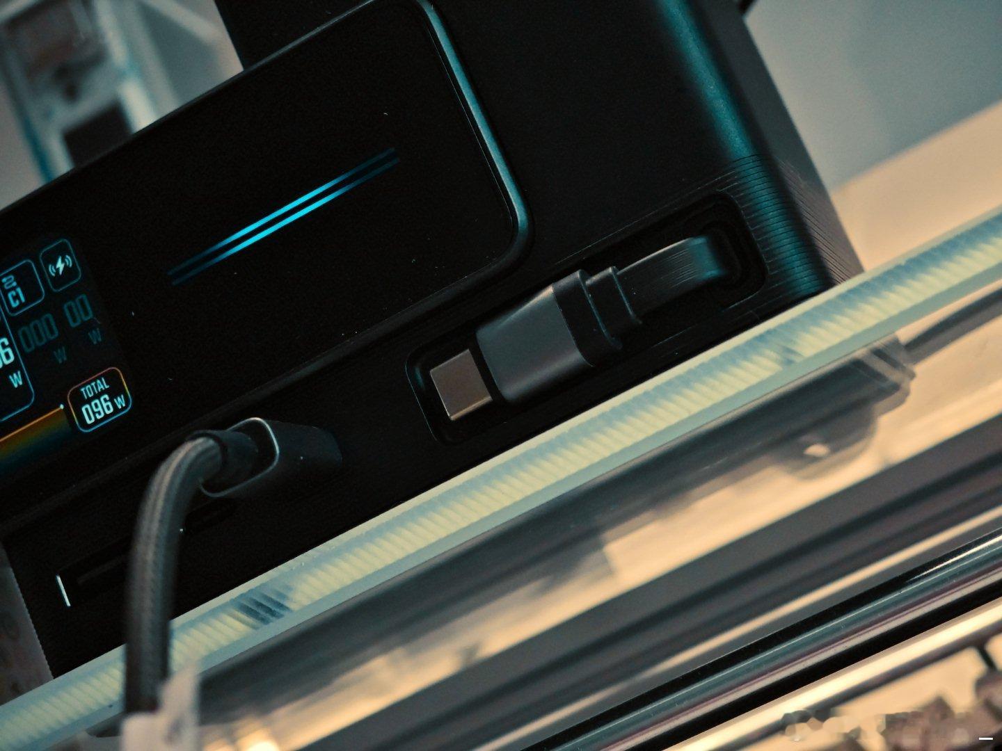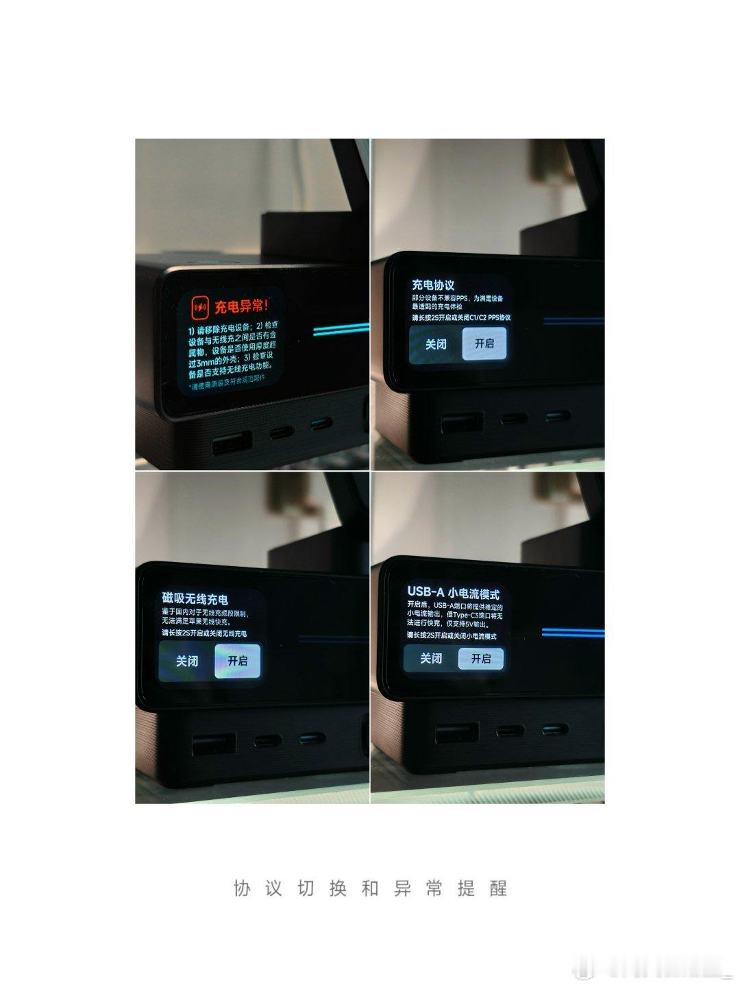 最后,谈谈一些细节。首先是经典的酷态科式多色拼接元素本次并没有出现在15号超级电能站上,取而代之的是非常冷峻的黑武士配色,如果不是经典的蓝色双长条呼吸灯,乍一看我觉得它确实没什么太多酷态科的经典元素,但仔细分辨还是能看出来很多,比如说可伸缩线,比如说经典按钮和万象屏,都算是酷态科比较经典的元素。本次按钮除开几个UI外,也可以单独进行提示:无线充电异常或者其他充电设置(比如说可以单独设置开启PPS与否)个人认为是相当不错的细节,只可惜操作仍稍显复杂。