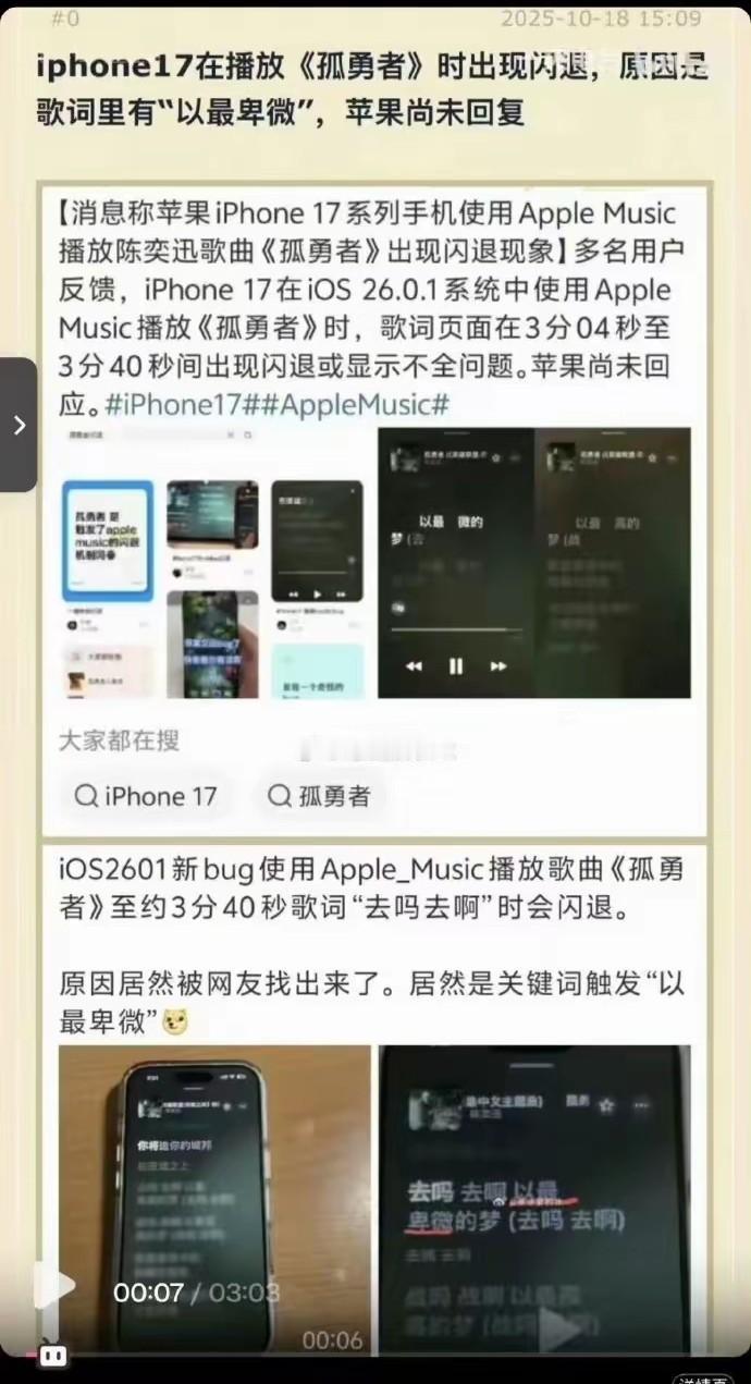 奇葩!苹果17播放《孤勇者》出现闪退,据说闪退原因是歌词中有“以最卑微”触发了《反以禁令》! 这、这、这……这后门监听是特别针对汉语版的吗?如果是真的,苹果,你还有下限吗?犹太资本这么疯狂了吗?难道苹果也被犹太资本控制了吗?这种有后门的手机还能用吗?