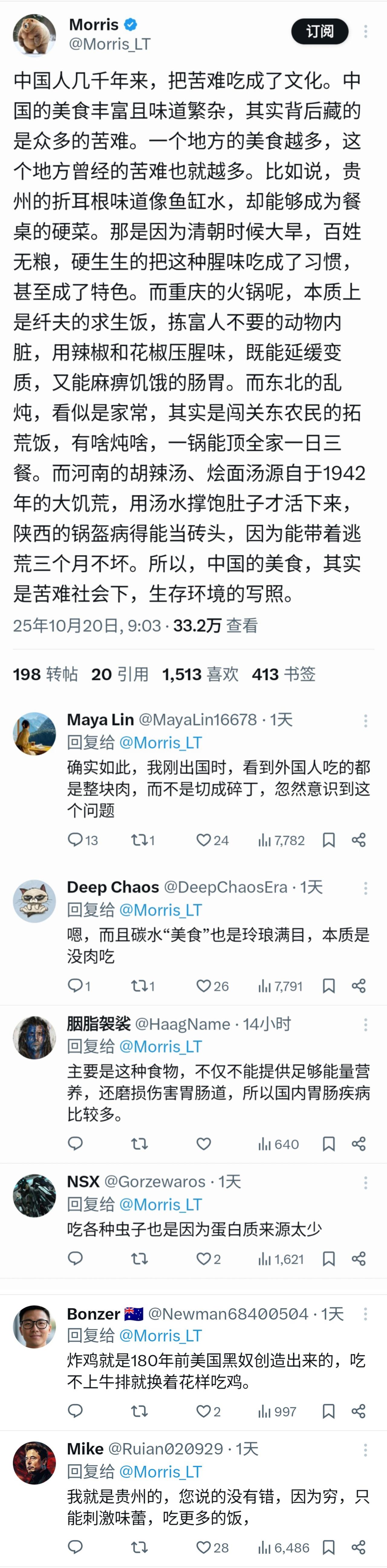 中国几千年的美食史,本质是部苦难史? 一位博主说,比如,贵州人吃折耳根,是清朝时闹荒,贵州人没粮,只能吃它,最后吃成了地方特色!重庆的火锅,一开始,是码头工人拣富人不要的下水,再加辣椒花椒压腥,结果重庆火锅成了招牌!东北的乱炖,是当年农民闯关东,有啥吃啥,都炖一块!至于河南的胡辣汤、陕西的锅盔,也都是饥荒背景下的产物。 这位博主的感想,让我想起读书时,一位外地同学只吃炒肉丝,不吃炒肉片,后知后觉的我,才想明白,他那个地区应该是早期物资匮乏,只能把肉切成肉丝炒来吃,显得肉多一点,然后他在这样的环境长大,习惯了。 博主认为,所谓的美食,背后反映出的,其实是当时社会下,生存环境的写照! 不过,从侧面看,这些美食也反映了老百姓在匮乏环境下,适应环境的智慧,但要完全将美食和苦难划上等号,就有点过了。