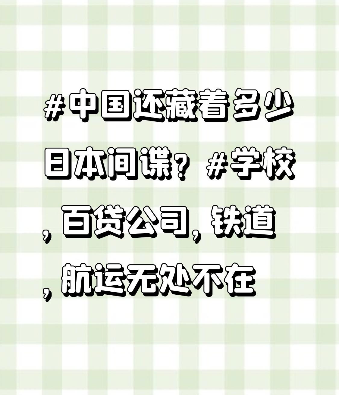 细思极恐啊,感觉日本间谍在中国的渗透面太广了。学校里,他们可能通过学术交流、文化活动等方式,套取我国教育科研方面的情报。百货公司人来人往,他们能观察消费市场、经济数据等信息。铁道可是国家重要交通命脉,间谍可能刺探铁路建设、运输调度等机密。航运方面,港口布局、货物运输等信息也可能被他们窃取。 之前就有新闻曝光过日本间谍窃取我国军事、经济等情报的案例。我们必须时刻保持警惕,提高防范意识,不能让这些心怀不轨的人得逞,守护好国家的安全和利益。