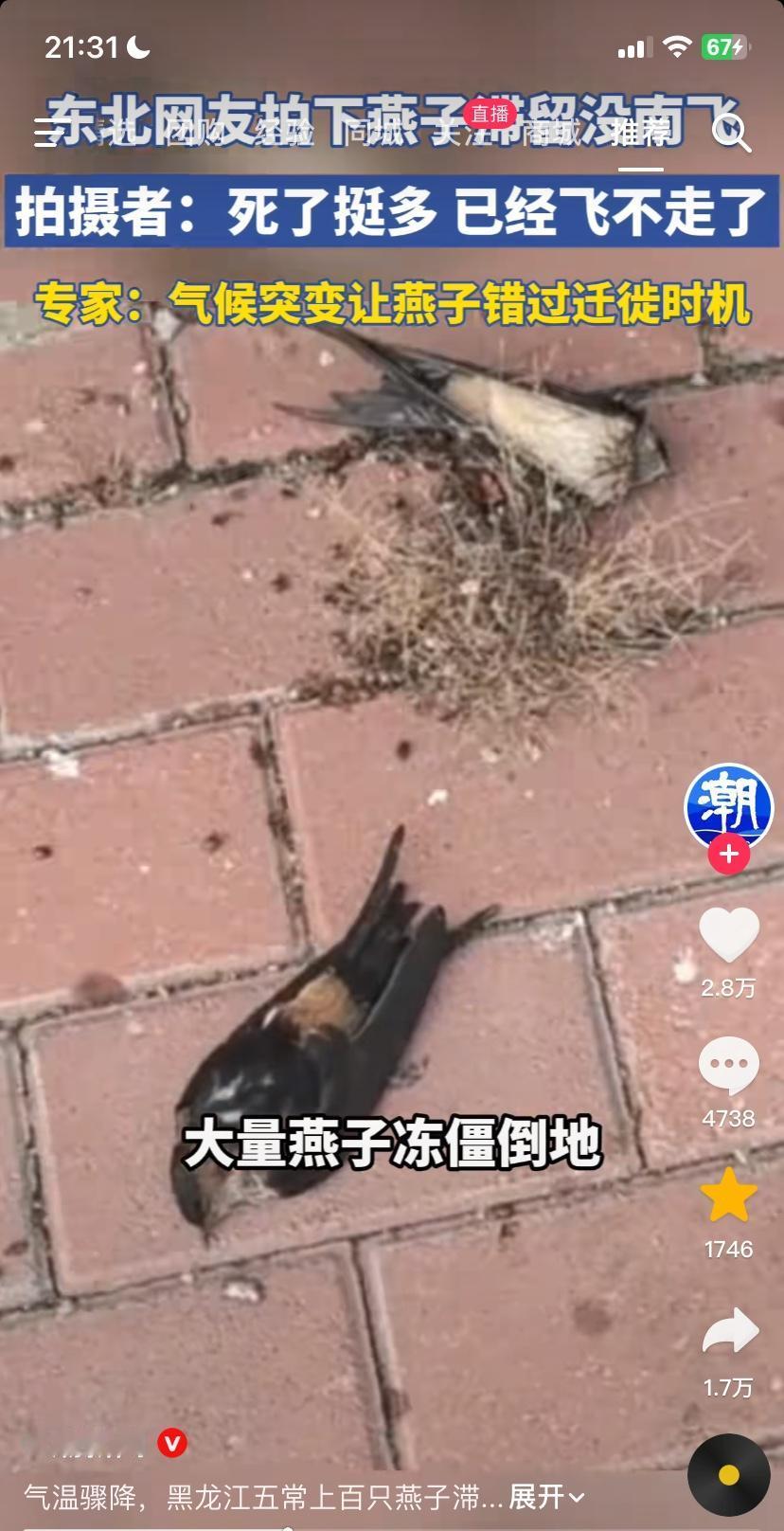 今年天气冷的怪冷的早,连燕子都没反应过来!一东北网友拍下燕子滞留,一些飞不动了,一些冻死了。估计这些燕子也是看树木看节令南飞,他们也没想到今年早早就冷了,像山西刚过国庆就几乎没暖和天气了,何况东北!