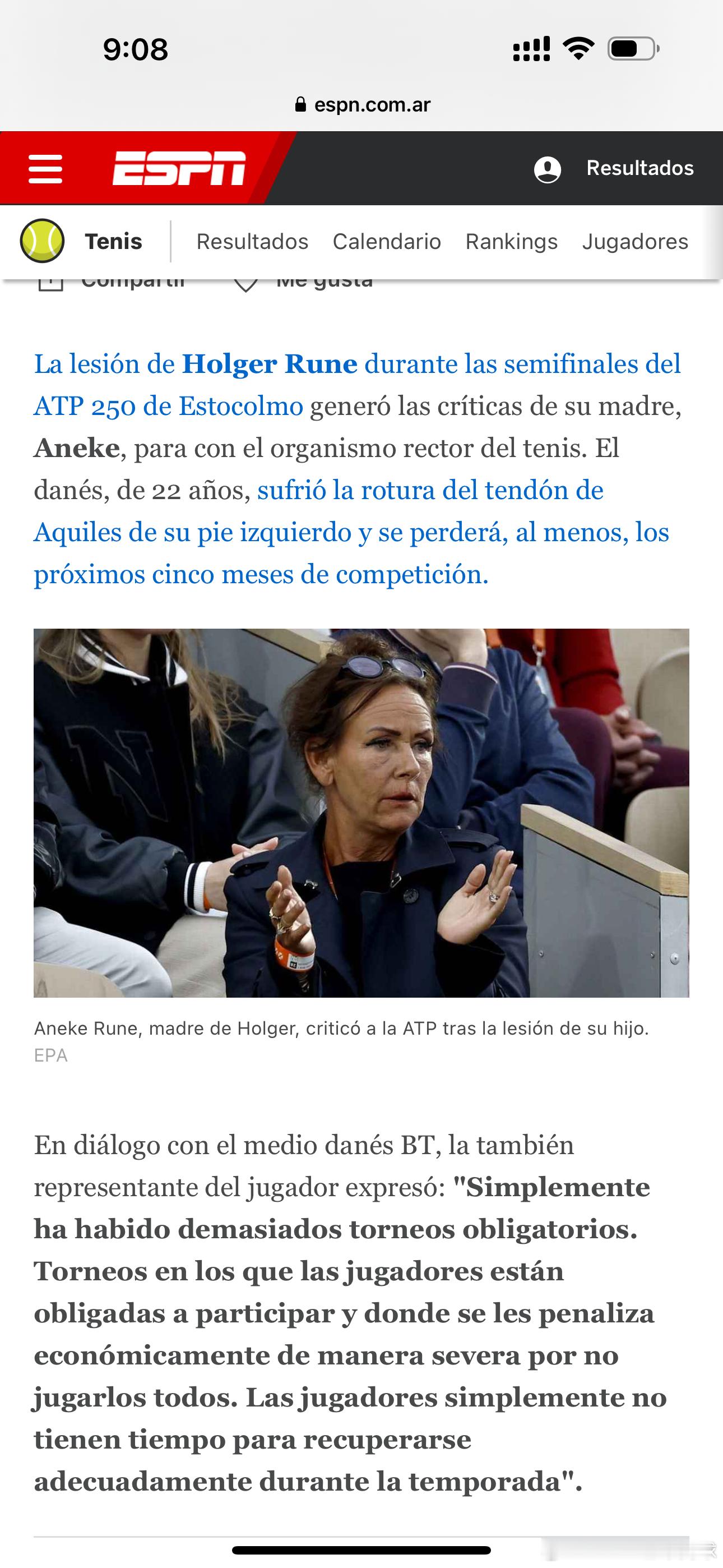 鲁内的母亲跟随她的儿子整个赛季,她总结了她对世界网球时刻的分析,她说:“我们必须包括几周的训练,在那里你可以进行体力工作,优化比赛并防止受伤。这对身体来说太多了。对于完全正常、健康和训练有素的身体来说,几乎不可能在一年多的网球运动员所期望中保持良好的状态。”