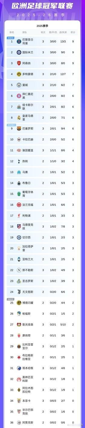 欧冠最新积分榜:巴萨国米阿森纳均取得3连胜,多特蒙德曼城奏凯保持不败,那不勒斯勒沃库森均遭惨败,穆帅的本菲卡遭遇3连败接近垫底。今天凌晨结束的9场比赛有3场比赛出乎意料,那不勒斯客场2:6惨败埃因霍温,只能说孔蒂的球队只适合且只想单线作战,如此惨败还是大跌眼镜;马竞0:4阿森纳,西蒙尼的球队好不容易有点起色,一场溃败又将士气打没了;本菲卡0:3纽卡斯尔,毕竟是穆里尼奥执教的球队,但遭遇3连败让球迷的期待碾得粉碎。卫冕冠军巴黎圣日耳曼7:2狂屠勒沃库森,西甲豪门巴塞罗那6:1大胜奥林匹亚科斯,进球真是毫不客气!