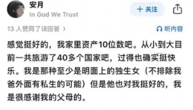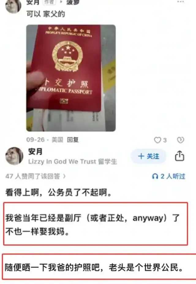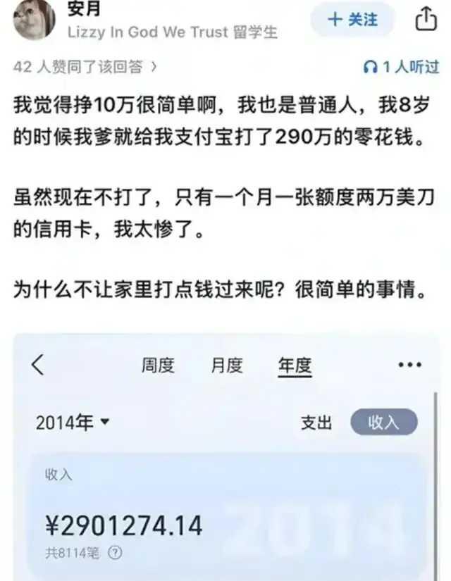 一个名叫安月的留学生,自称家里资产十位数。她八岁账户到账290万元,说是父亲在她八岁时完成的一项大工程,把收入的十分之一给了她花。还说,她现在每月信用卡额度两万美元。 她父亲是厅级干部,旅游四十多国,是个世界公民,她还把护照本晒满朋友圈。 有人不相信她说的是实话,也有人说,就算是真实的,她不可能敢如此直白,毫不遮掩。 但谁又敢保证她说的不是实话呢? 谁又敢保证人一有钱不会狂妄呢? 估计她是北极鲶鱼第二,不过她这条鲶鱼要比北极的那条要大上十倍不止,应该叫北冥大鲲。 不管是鲶鱼还是大鲲,既然跳出来了,那就应该彻查!