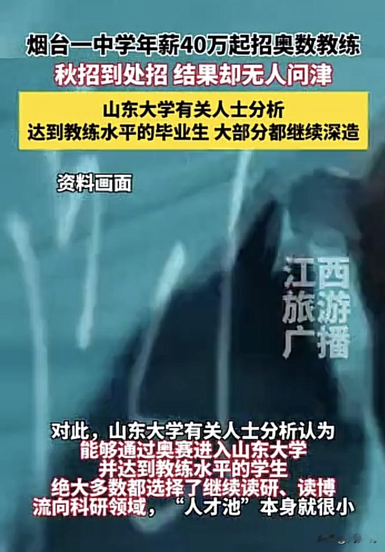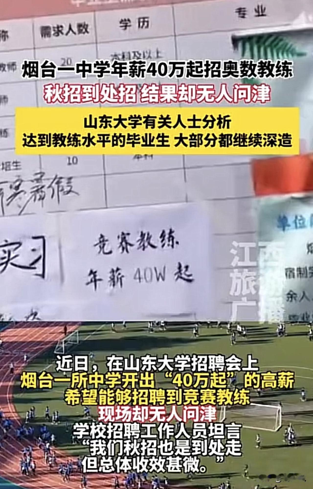 #中学年薪40万招竞赛教练无人投简历#“尴尬,年薪40万招竞赛教练竟无人投简历!”近日,山东大学招聘会上,烟台一中学开出“年薪40万起”招聘竞赛教练,却无人投递简历,引热议。 校方表示,他们秋招多站奔波,但山大站收效甚微。业内人士分析,能达到竞赛教练水平的学生多选择继续深造,流向科研领域,人才池本身就很小。对地方中学而言,直接通过校招找到成熟教练难度大,可能需要从名校挖角后再内部培养。 对此情况,众多网友纷纷表示,“竞赛教练不仅需要专业知识,还需丰富经验和培养能力。高薪虽有吸引力,但人才培养周期长,学校或许该考虑更长远的人才储备计划。” 这事在周少看来,高薪确实能吸引眼球,但竞赛教练不仅要有专业知识,还得有实战经验和培养学生的能力。 很多顶尖学生毕业后更愿意继续深造,而不是直接当老师,这导致人才储备不足。学校与其只靠高薪“抢人”,不如和高校、培训机构合作,建立长期培养机制,让更多年轻人愿意投身教育。 对于这样的现象,大家怎么看呢?#长沙新朋友# #寻美三湘#
