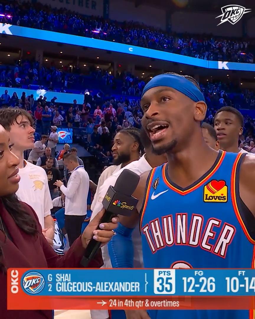 本场比赛,雷霆后卫谢伊-吉尔杰斯-亚历山大首发出战47分钟,26投12中,三分球9投1中,罚球14罚10中得到35分5篮板5助攻2抢断2封盖。