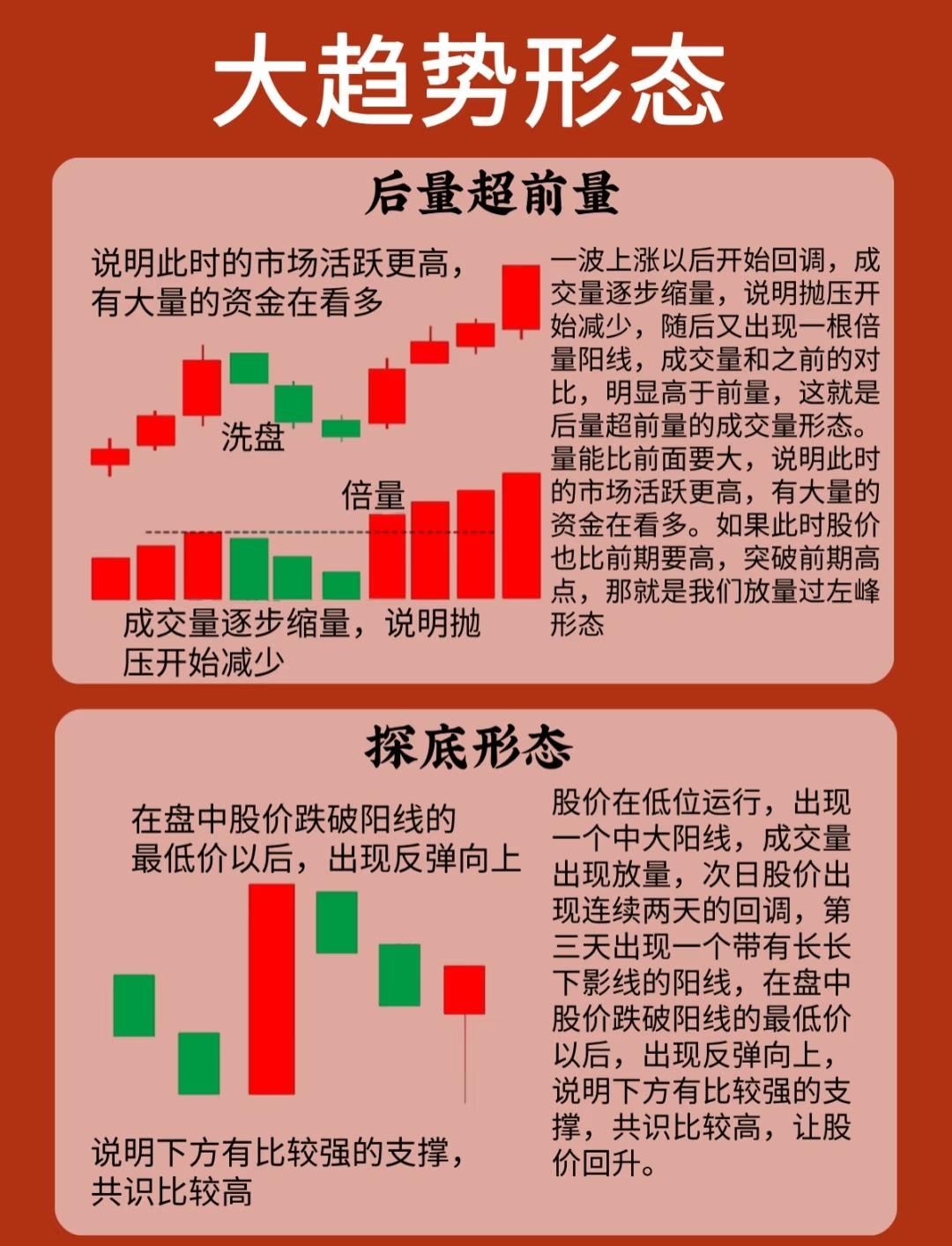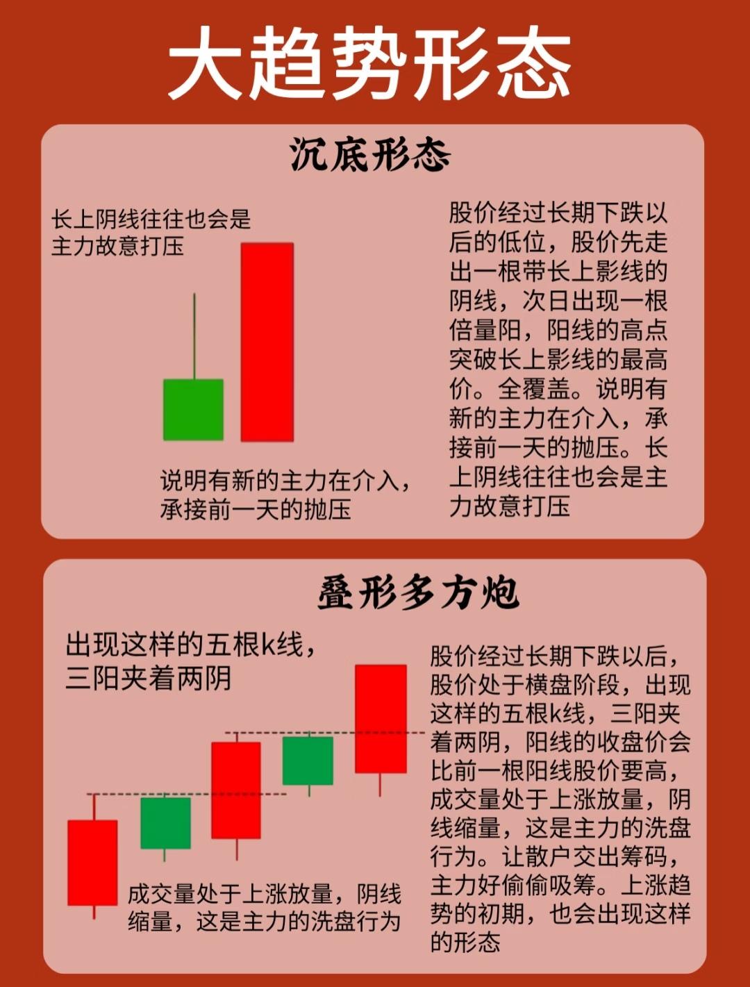 以下是对其中介绍的五种典型“大趋势形态”K线组合的简要总结: 一、长阴短柱,次日反包 形态特征: - 在股价低位,先出现一根跌幅超过5%的中大阴线(长阴),但成交量却异常缩小(短柱),与常理中“大跌应放量”不符。 - 次日出现一根放量中大阳线,不仅收复失地,还突破前一日长阴的最高价(即反包)。 市场含义: - 大阴线通常是主力故意打压、洗盘的行为,而非真正出货(因成交量小)。 - 次日放量反包说明洗盘结束,主力吸筹完毕,趋势可能反转向上,是看涨信号。 二、底部双倍阳 形态特征: - 在低位区域,出现两根不相邻的阳线,它们的成交量显著放大(倍量),即成交量柱明显高于平常。 - 第二根倍量阳线的成交量通常比第一根更大。 市场含义: - 倍量阳线是主力资金积极吸筹的表现。 - 两根倍量阳线,尤其是第二根量能更大,意味着主力正在加大吸筹力度,已获取大部分筹码,后续上涨概率较高,属于底部吸筹信号。 三、后量超前量 形态特征: - 股价经历一段上涨后回调,期间成交量逐步萎缩,说明抛压减轻。 - 回调后,出现一根成交量明显放大(倍量)的阳线,其成交量超过前一波上涨时的量能,甚至股价突破前期高点。 市场含义: - 成交量放大代表资金重新活跃、看多情绪增强。 - 若股价同时创出新高,形成“放量过左峰”形态,是强烈的继续看涨信号,表明新一轮上涨可能启动。 四、沉底形态 形态特征: - 股价长期下跌至低位后,先出现一根带长上影线的阴线(通常实体较小),次日出现一根倍量阳线。 - 该阳线不仅收阳,而且高点突破前一天长上影线的最高点(全覆盖)。 市场含义: - 长上影阴线可能是主力打压吸筹或试盘动作,次日倍量阳线则表明新主力开始介入,并承接抛压。 - 这是一种主力开始进场的信号,股价可能止跌企稳,有望走出底部,属于见底回升信号。 五、叠形多方炮(三阳夹两阴) 形态特征: - 股价长期下跌后进入横盘阶段,出现由三根阳线夹着两根阴线组成的五根K线组合,整体趋势微微向上。 - 阳线收盘价逐步抬高,且阳线放量、阴线缩量。 市场含义: - 这种组合常见于主力洗盘阶段,通过拉阳线吸引关注,再用阴线震仓洗出浮筹。 - 放量阳线说明主力在吸筹,缩量阴线则是清洗跟风盘。 - 若出现在上涨初期,是主力悄然布局、准备拉升的信号,属于趋势启动前的蓄势形态,后期看涨。 总结:这五种“大趋势形态”都是主力资金在股价运行不同阶段(如底部、洗盘、回调后)的典型操作留下的K线痕迹,它们共同特点是: - 在看似弱势或震荡的表象下,隐藏着主力吸筹、洗盘或试盘的动作。 - 通过量价配合(如倍量、缩量、反包、突破等)发出趋势反转或继续上涨的信号。 - 投资者若能在这些形态出现时结合市场环境、个股基本面综合判断,将有助于捕捉潜在的上涨机会。