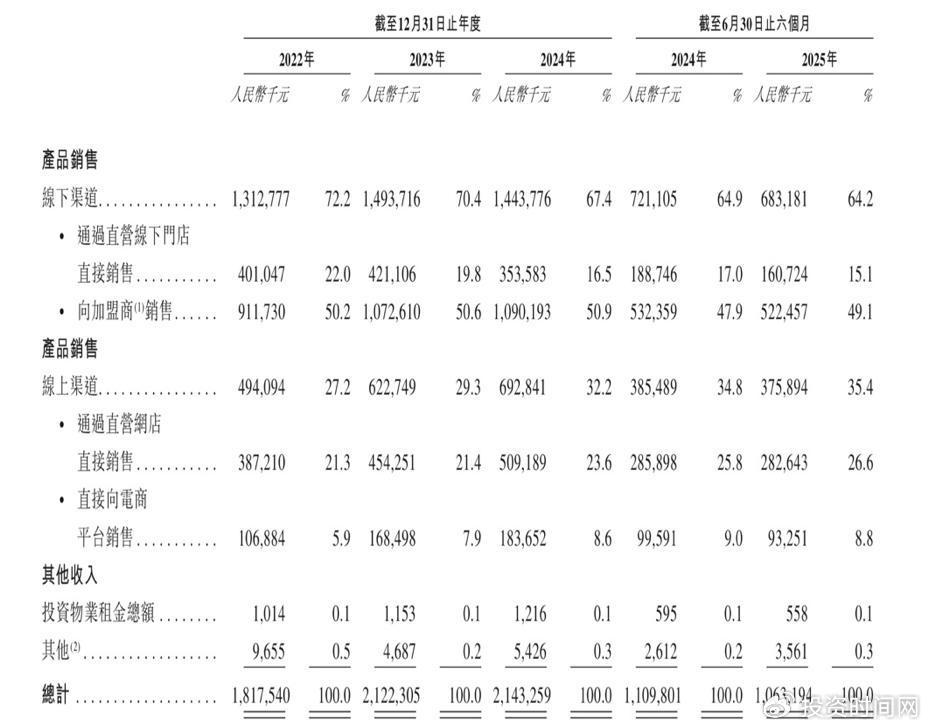 目前,八马茶业已形成“直营+加盟”“线上+线下”的全渠道销售体系,其中加盟模式是公司重要的销售渠道之一。招股书数据显示,2022年至2024年及2025年上半年,该公司加盟商数量分别为1033家、1202家、1252家及1228家;同期八马茶业向加盟商销售产生的收入占总收入的比例分别为50.2%、50.6%、50.9%及49.1%。