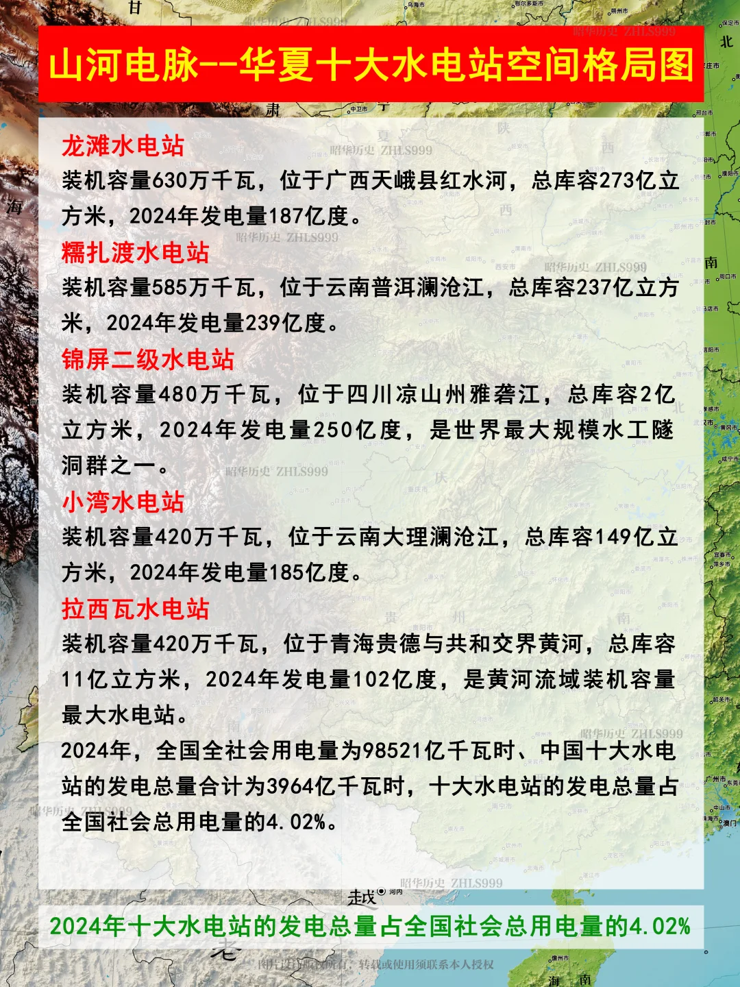 2024 年,全国全社会用电量为 98521 亿千瓦时、中国十大水电站的发电总量合计为 3964 亿千瓦