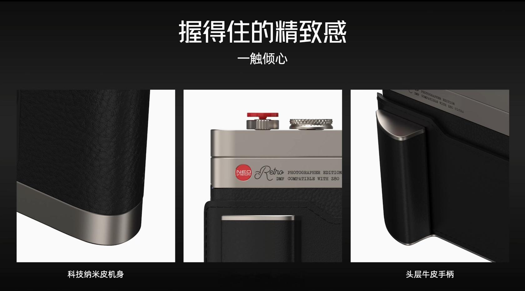 科技纳米皮、钛色铝合金边框、头层牛皮真皮手柄,打造温润细腻的质感。量身定制智能相机控制条,实体机械操作键、以及可自定义功能的拨杆和转盘。