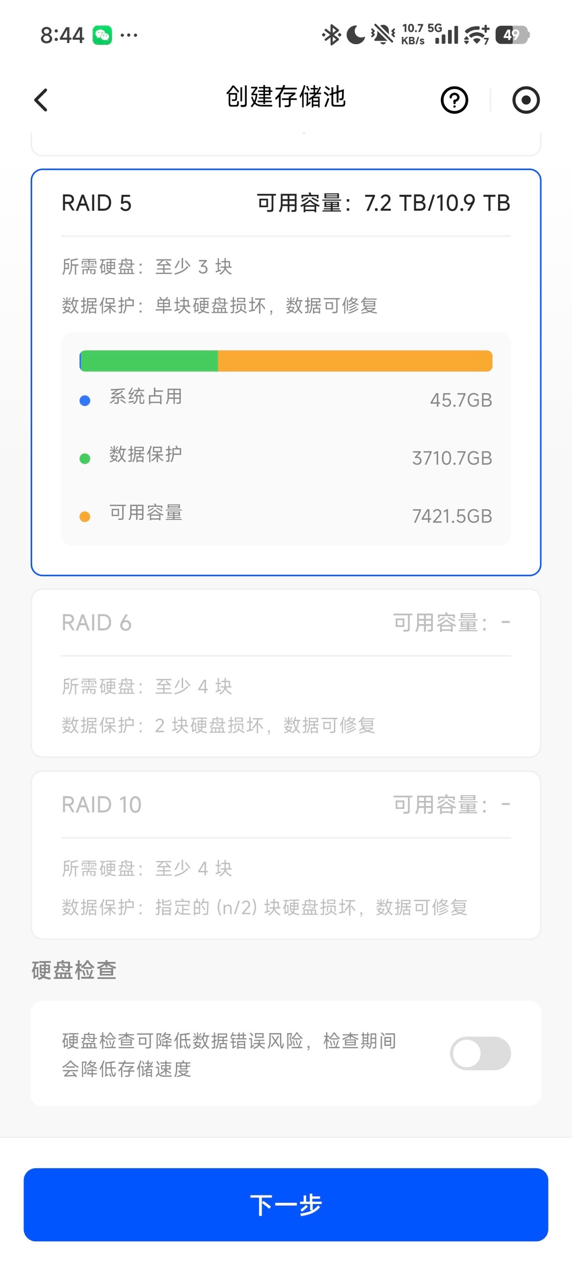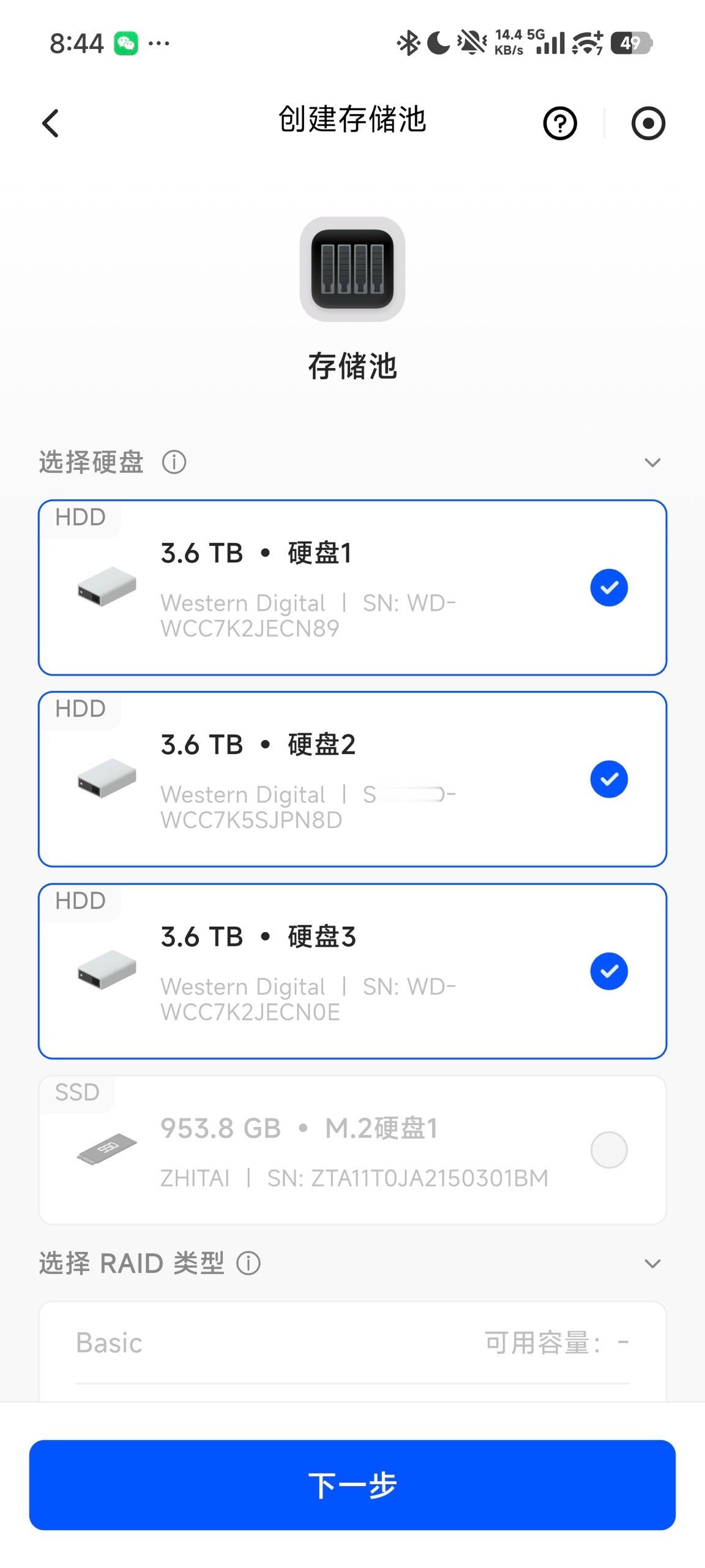 在正确使用快装卡扣安装好硬盘并开机后,第一时间要做的就是给硬盘设置存储池分配RAID模式。我本人是用3块西数的4T紫盘组成了RAID5模式。当然绿联NAS 也支持包括Basic、JBOD、RAID0、RAID1、RAID5、RAID6、RAID10这7种存储模式,甚至支持快照、无损切换RAID模式(Basic 到 RAID 1再到RAID 5)、跨存储池备份、ISCSI协议映射为电脑本地磁盘等专业NAS玩家比较关心的功能。我这里选择RAID5是综合考虑了我的盘位和对安全与速度需求后的最后决策。
