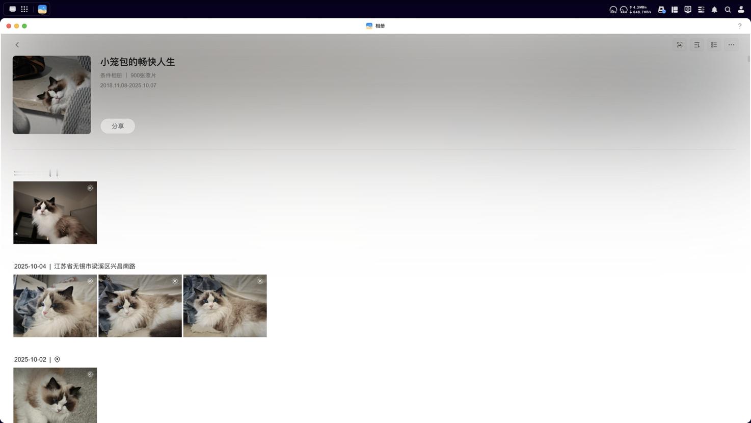 系统相册支持自动备份所有移动平台的图片和视频,这当然很常规,不错的是它可以通过内置的EXIF和其他信息配合AI模型框选出对应的条件进行单独成册,比如说我选择AI大模型帮我识别到的猫这一关键词一键全部选中创作了我家主子的专属相册,这就大大简化了我自己寻找归纳分类的流程,可以说是非常贴心。