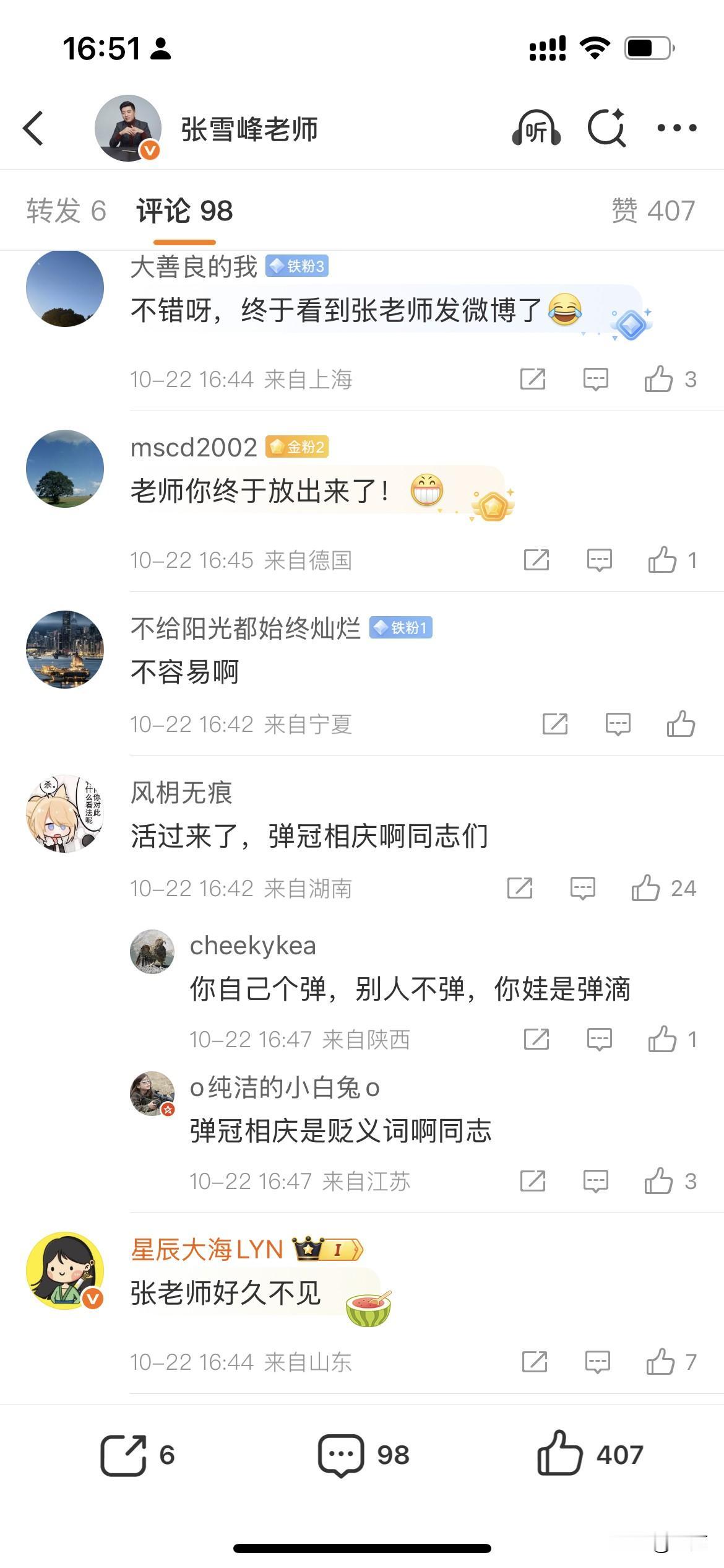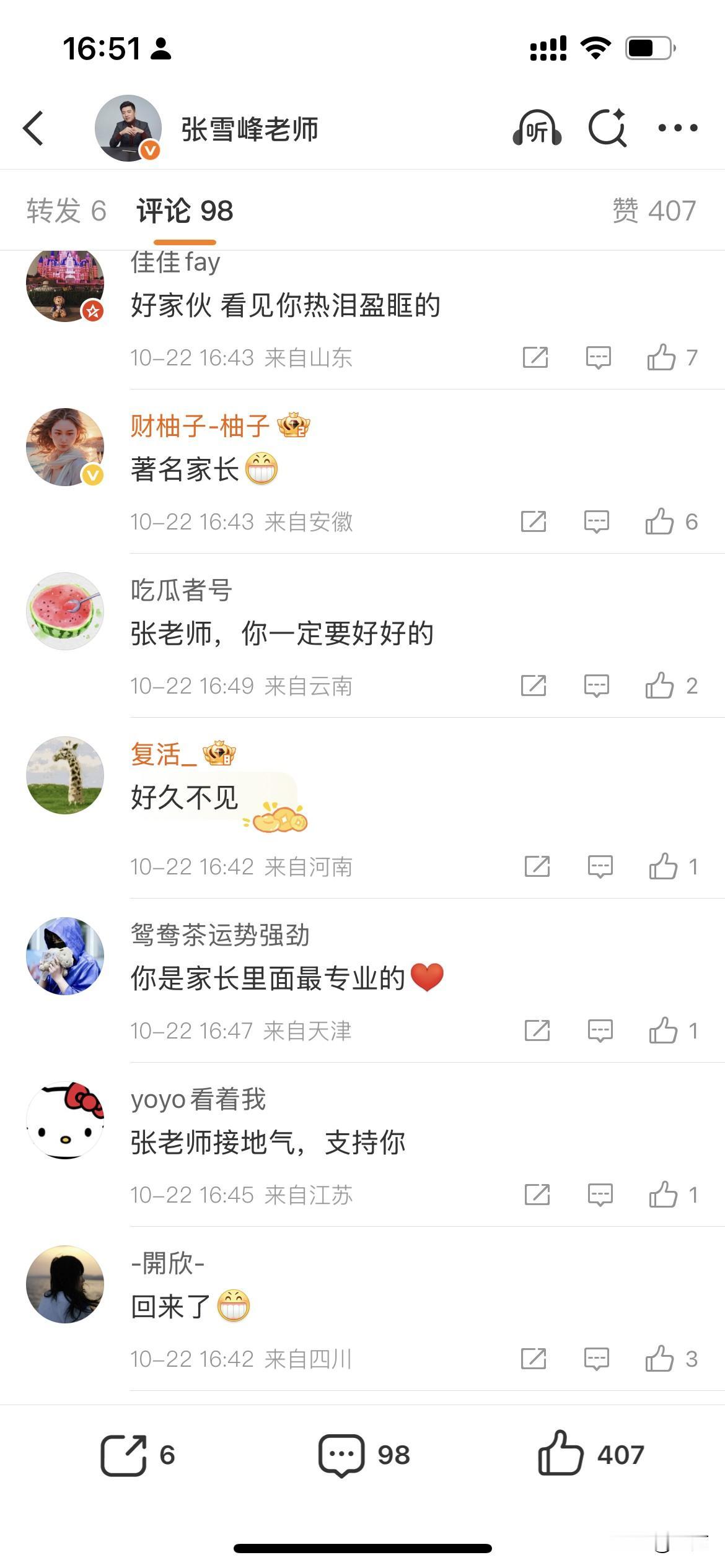 张雪峰,时隔一个多月,更新自己的社交网络! 就在刚才,张雪峰更新了自己的社交网络,上一次更新社交网络还是9月10号,现在已经二十多号了,过去了,差不多一个半月的时间了,他没有出现在任何社交网络上! 因为他的视频目前还在处罚当中,所以没法更新,他的土味平台也就是微博,目前没有处理,因此他还是可以正常的更新。 他更新的内容也很简单,就是下午放学的时候去接自己的孩子! 他评论区在谁的粉丝可能都是家长吧,看到他放出来之后都非常的激动,不知道这是不是第一步,意味着他又要开始慢慢地松动了!