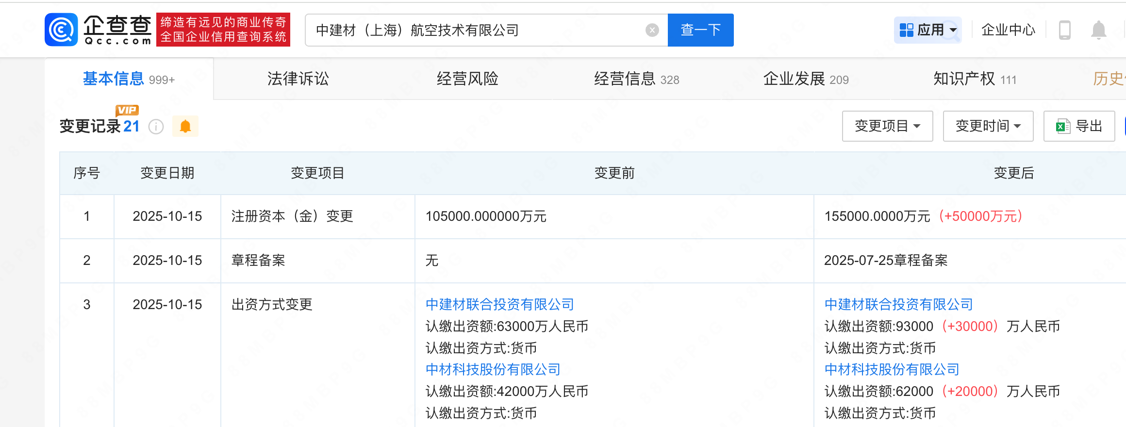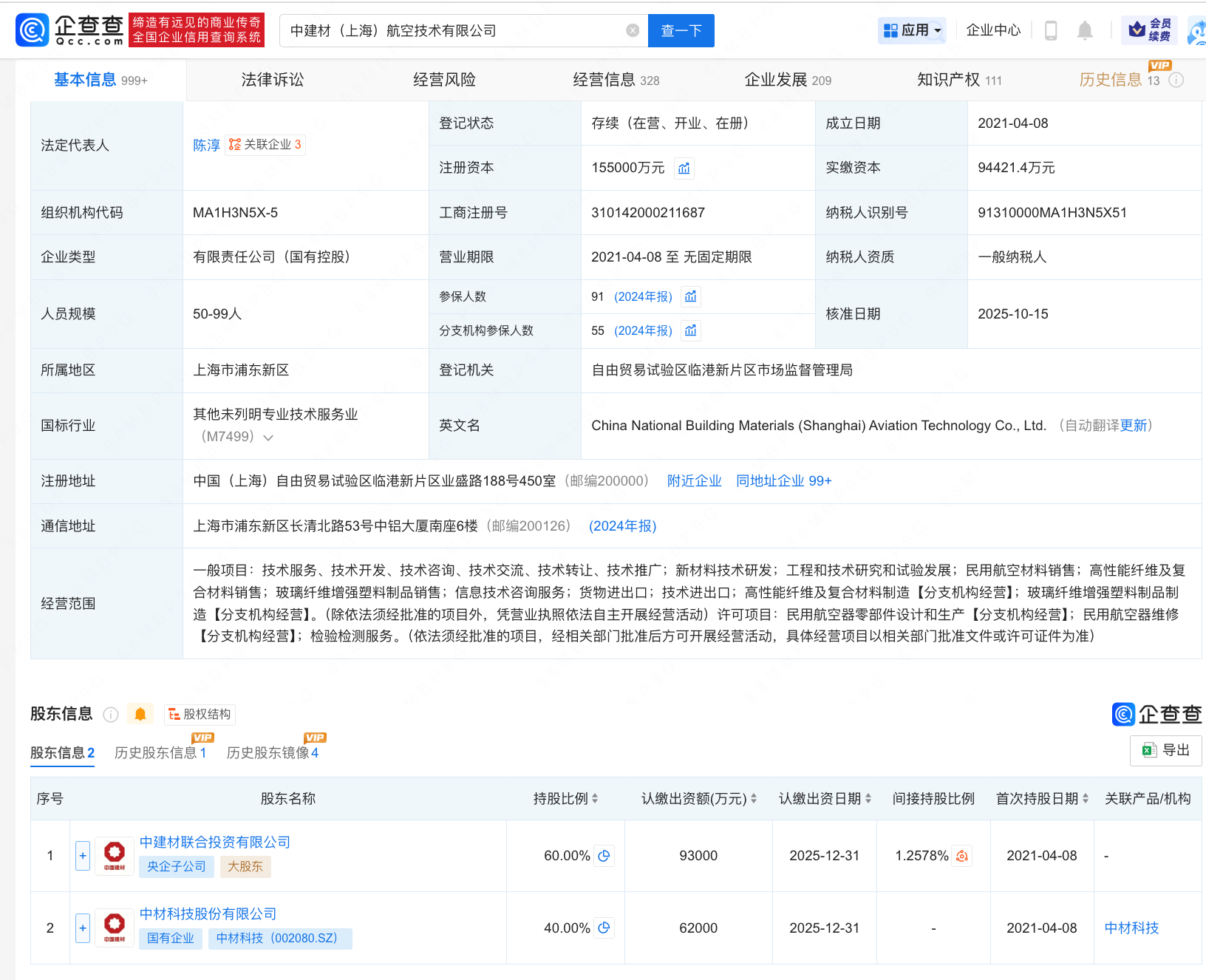 企查查APP显示,近日,中建材(上海)航空技术有限公司发生工商变更,注册资本由10.5亿人民币增至15.5亿人民币,增幅约48%。企查查信息显示,该公司成立于2021年4月,法定代表人为陈淳,经营范围包括新材料技术研发、工程和技术研究和试验发展等,由中建材联合投资有限公司、中材科技(002080)共同持股。