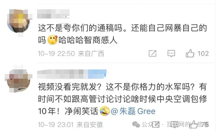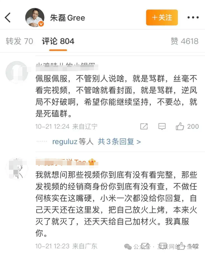 此前,朱磊曾发文曝光“友商”雇佣水军攻击格力。但不少网友反过来质疑,是格力在带节奏攻击小米。围绕“谁雇了水军”这一问题,双方粉丝在网络上争论不休。