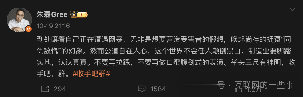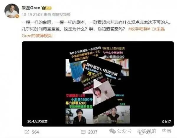 小事哥注意到,从10月19日晚起,朱磊在微博上连发数条“炮轰帖”,不仅贴出大量截图,质疑某些账号“话术整齐划一”,还质问“同样都是1.5匹的空调,为何小米售价不到1700元,而格力却高出千元以上?”
