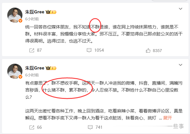 朱磊称,最近两天,有大批网友在他的微博、抖音和直播间留言,大多带有侮辱性内容。其中不乏“猪不群”“累不群”等带有暗示的词语。