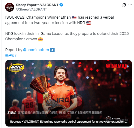 外媒爆料:冠军赛双冠王Ethan与NRG达成口头协议,续约两年