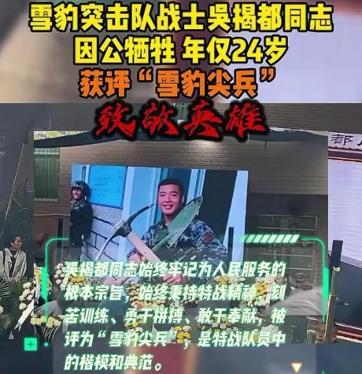武警雪豹突击队战士吴揭都,生命永远定格在24岁!能成为雪豹突击队的一员,可谓是“万里挑一”啊!太可惜了! 这两天刷到雪豹突击队战士吴揭都在执行任务时牺牲的新闻!一个风华正茂的青年,将自己的青春和热血都献给了国家! 吴揭都,凤凰县吉信镇人,2001年7月3日出生,2022年3月入伍,2024年12月,因表现出色,被选拔到武警雪豹突击队。曾荣获“雪豹尖兵”的称号。2025年10月15日在执行任务时壮烈牺牲,年仅24岁! 据媒体报道,在10月15日的训练任务中,吴揭都突遭意外,英勇牺牲了,把年轻而宝贵的生命奉献给了自己热爱的部队! 国家无战事,军人有牺牲! 我们能够平安地生活,是因为有那么一群人时刻准备着保卫我们!他们吃了太多的苦,受了太多的累,甚至流血、牺牲! 在痛心遗憾一个优秀青年逝去的时候,也希望我们的拥军拥属工作能做得更好!军人及家属的付出需要全社会的关注、关心和关爱! 所以,在社会上遇到军人优先的时候,一定要礼让军人!因为,在困难和危险的时候,一定也是军人冲锋在前! (雪豹突击队,前身为雪狼突击队,曾隶属中国人民武装警察部队北京市总队特勤支队特勤大队,组建于2002年12月13日。其参加“合作-2007”联合军演时更名为雪豹突击队。 2003年,雪豹突击队改编为中国人民武装警察部队北京市总队雪豹突击队。与中国人民武装警察部队特警学院特战大队(2014年更名为猎鹰突击队)一起组成了北京市的反恐力量。 2017年,雪豹突击队升为旅级支队,转隶武警第二机动总队,移防广州。) 吴揭都 雪豹特种兵 雪豹特种兵