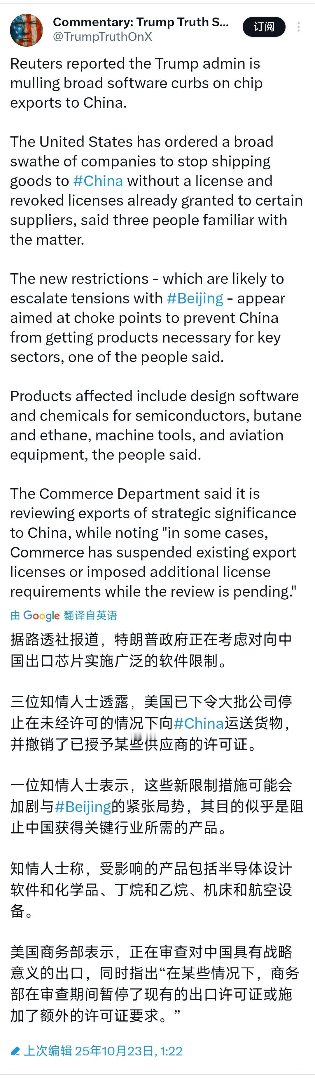 据路透社报道今天(10月23日),特朗普政府正在考虑对向中国出口芯片实施广泛的软件限制。 本月10日中国商务部发布的稀土技术出口管制新规,该政策明确规定,稀土开采、冶炼、磁材制造等环节的核心技术及载体未经许可不得出口。 作为全球70%稀土供应的掌控者,中国此举精准切中了美国军工、新能源等产业的命脉。美国国防部曾公开承认,其F-35战机每生产一架就需要417公斤稀土材料,而国内至今未建立完整替代供应链。 面对这一压力,特朗普政府选择以软件为突破口进行反制。据知情人士透露,美方拟将限制范围从硬件扩展至“含美国软件”或“使用美国软件生产”的所有产品,从笔记本电脑到航空发动机均在管控之列。 这种“数字长臂管辖”的逻辑,与2022年俄乌冲突后美国对俄实施的出口管制如出一辙——通过控制全球软件生态,间接掌控硬件产品的流通。 尽管美国在软件领域占据绝对优势,但该计划的可行性存疑。一位参与讨论的官员坦言:“几乎所有现代电子产品都依赖美国软件,全面禁运等于自毁全球供应链。” 市场反应印证了这一担忧——消息传出后,纳斯达克指数单日跌幅达1%,英伟达、AMD等芯片巨头股价领跌,投资者担忧此举将迫使中国加速技术自主,最终导致美国企业丧失全球最大市场。 历史经验也提供了警示。2024年特朗普曾要求英伟达、AMD对华芯片销售收入的15%作为许可费,以换取H20等型号的出口许可。 这一“抽成式管制”虽在短期内为美国财政带来36亿美元收入,却导致英伟达在中国市场份额从95%骤降至50%,空出的市场被华为、寒武纪等本土企业迅速填补。 更关键的是,中国AI初创公司深度求索(DeepSeek)通过算法优化,仅用传统芯片就实现了与顶级GPU相当的模型效率,直接挑战了“硬件决定论”的行业认知。 此次争议暴露出更深层的规则博弈。中国新规借鉴了美国的“外国直接产品规则”(FDPR),即任何使用美国技术生产的物品,无论在哪里组装,都需遵守美方出口管制。 这种“规则对等”的回应,标志着中美科技竞争已从产品层面升级至制度层面。欧盟、日本等传统盟友在此背景下陷入两难:若跟随美国制裁,将面临中国稀土断供风险;若保持中立,又可能被排除在美国主导的技术体系之外。 值得注意的是,美国国内对极端管制措施的反对声日益高涨。19名前政府官员联名公开信指出,将国家安全泛化为贸易工具,可能导致“所有产品都需要许可证”的荒谬局面,最终削弱美国技术竞争力。 这种担忧在产业界已成共识——波士顿咨询公司预测,若中美完全脱钩,美国半导体企业将损失18%的全球市场份额和37%的收入。 截至目前,白宫对具体措施保持沉默,仅由财政部长贝森特确认“所有选项都在考虑中”。这种模糊态度被分析人士解读为典型的“施压策略”——通过释放威胁信号迫使中方让步,而非真正实施自损八百的禁令。 但无论如何,此次事件已清晰展现技术霸权的双重性:它既是美国维持全球领导力的核心工具,也是引发产业反噬、加速对手技术突破的催化剂。 当稀土与软件成为大国博弈的新筹码,全球产业链正站在十字路口。是继续沿着“技术封锁-自主创新-规则重构”的路径走向彻底分裂,还是通过对话协商建立包容性技术秩序?这场没有硝烟的战争,最终考验的不仅是技术实力,更是对未来世界格局的想象力。 那么您认为,技术霸权能否真正决定国际竞争的胜负?欢迎在评论区分享您的观点。