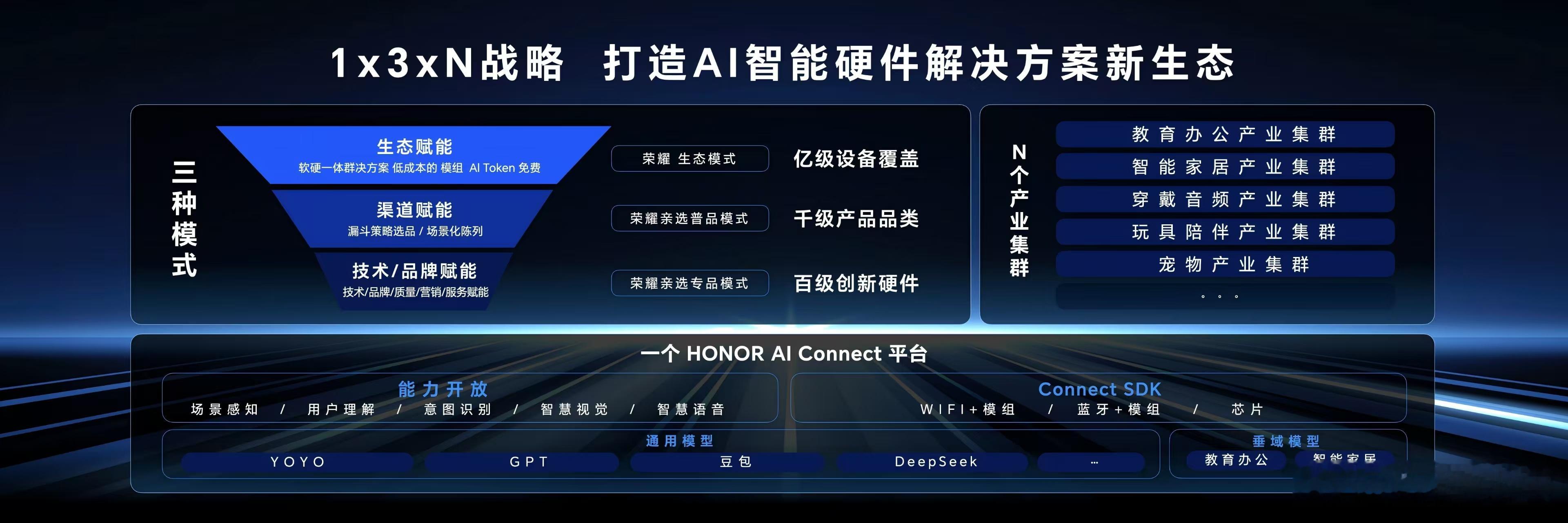 2025年10月23日,荣耀AI终端生态大会于深圳坪山举办。大会上,荣耀产品线总裁方飞 系统阐述了荣耀AI生态布局与成果,并宣布正式推出1x3xN战略,即一个平台,三项赋能,N个产业集群:通过一个HONOR AI Connect平台,开放荣耀的AI能力给所有的生态合作伙伴;通过生态赋能、渠道赋能和技术品牌赋能,三种不同的模式扶持合作伙伴;并且将覆盖教育办公、智能家居、音频穿戴、玩具陪伴、宠物等N个产业集群。