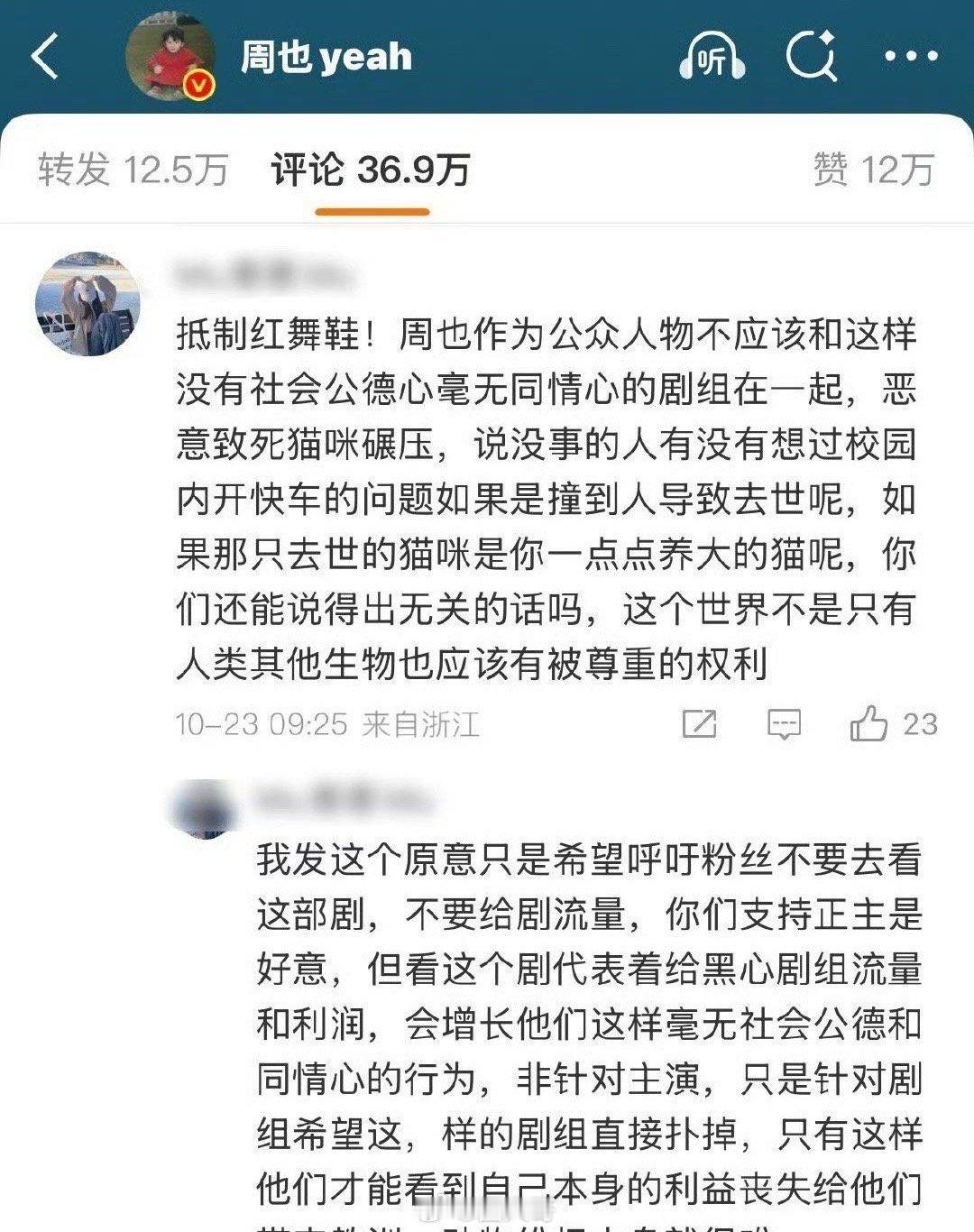 网友在周也评论区抵制红舞鞋