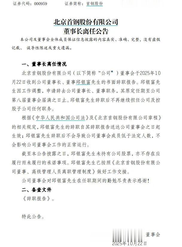 首钢股份22日晚间公告,收到公司董事长、董事邱银富的书面辞职报告。邱银富因工作调整,申请辞去公司董事长、董事职务,其原定任期至公司第八届董事会届满之日止。邱银富辞职后不再继续担任公司及控股子公司任何职务。