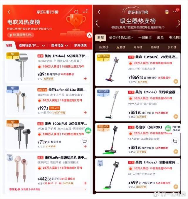 《BUG》栏目注意到,尽管已经迎来“双十一”家用电器大促,但京东电吹风热卖总榜销量前10中,戴森无一款产品上榜;前20名中唯一上榜的一款HD16智能吹风机,名次仅位于第15名,且历史累计销量也远低于前排同行。而公司主营的吸尘器产品,虽在京东热销榜前10中仍留有第一和第六两个席位,但相关产品的累计销量,也已明显落后于美的、苏泊尔(47.730,0.03,0.06%)、海尔等国产清洁品牌。