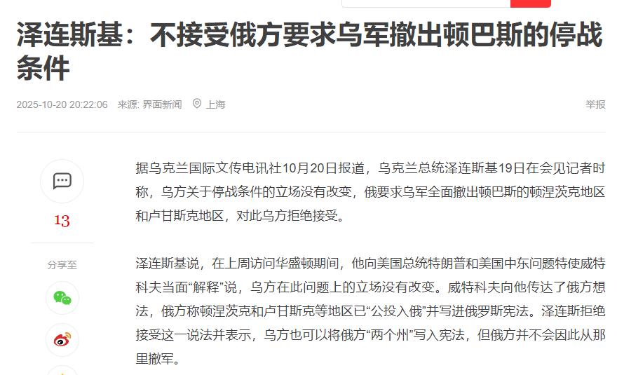 乌克兰总统宣布了! 10月20日,乌克兰总统泽连斯基公开宣布,坚决不接受俄罗斯要求乌军完全撤出顿巴斯地区作为停战的条件,他强调乌方在此问题上的立场不可动摇。 顿巴斯根本不是地图上随便划的一块破地,那是乌克兰的“心脏”加“饭碗”,说实在的,丢了顿巴斯,乌克兰差不多就丢了半条命。 顿巴斯在乌克兰东边,占地6万平方公里,差不多有三个北京大,包含顿涅茨克和卢甘斯克俩州。这儿地下埋着足足600亿吨煤炭,乌克兰七成多的煤都在这儿,还是欧洲数一数二的大煤田。 早从19世纪起,一个威尔士商人休斯在这儿建了第一座钢铁厂,打那以后,顿巴斯就成了乌克兰工业的“发动机”。最风光的时候,全乌克兰79%的煤、60%的钢铁、40%的机械,全是从这儿造出来的。 乌克兰最大的钢铁公司Metinvest,旗下的波克罗夫斯克煤矿是它唯一能搞到炼焦煤的地方。2022年俄乌打起来的时候,俄军为了抢这座煤矿,足足打了半年硬仗,因为没了这矿,乌克兰的冶金业就彻底瘫了。数据最实在:2021年乌克兰一年还能产2200万吨钢,到2024年直接跌到600万吨,等于拦腰砍了两回,惨得很。 顿巴斯的日子从2014年就变糟了。那年乌克兰政局一乱,亲俄的武装就在顿涅茨克和卢甘斯克宣布成立“人民共和国”,俄乌冲突就这么正式开了头。到2022年,普京承认这俩“共和国”独立,还发动了特别军事行动,目标就是把整个顿巴斯拿下来。 这仗一打就是五年,双方在顿巴斯投了几十万兵。2024年俄军又发起“顿涅茨克攻势”,专门盯着波克罗夫斯克这些关键地方打。乌军靠着第二道防线硬撑,可到2025年初,波克罗夫斯克煤矿还是没法子,只能停产了,这座靠工业吃饭的重镇,眼看就要全被俄军占了。更要命的是,俄军已经把乌军往后方运物资的两条公路掐断了,就剩一条补给线,也悬得很。 面对俄军步步紧逼,泽连斯基为啥死都不退?道理特简单:顿巴斯真丢不得。从经济上说,顿巴斯给乌克兰挣的出口钱占了三成,要是丢了这儿,乌克兰的GDP最少得少三分之一;更关键的是,顿巴斯的煤和钢铁是乌克兰造武器的底子,没了这些,乌军连炮弹都造不出来,还怎么打仗? 从政治上看,顿巴斯住着400多万人,其中45%是俄罗斯族。要是泽连斯基答应撤军,不光国内得骂他“卖国贼”,还可能捅更大的篓子,克里米亚、敖德萨那些本来就有分离想法的地方,说不定也会跟着闹起来。泽连斯基心里门儿清:退一步,可能整个国家都垮了。 可现实特残酷。前线军官都说,乌军已经做好了“俄军进波克罗夫斯克”的准备。更头疼的是,美国新总统特朗普上台后,还想让乌克兰“拿土地换和平”,逼他们放弃顿巴斯来换停火。泽连斯基现在就卡在中间:不退,可能连整个顿巴斯都守不住;退了,国家的未来就没了,两头都是难。 顿巴斯的炮火背后,其实是大国在掰手腕。俄罗斯要是占了顿巴斯,既能打通到克里米亚的“陆地通道”,还能把乌克兰的工业底子砸了;而美国和欧盟帮着乌克兰守,不光是为了地缘上的利益,还有经济算盘,乌克兰出口的粮食和能源,对欧洲稳不稳定特别重要,断了可不行。 还有个挺微妙的点:俄罗斯自己就是产煤大国,为啥还非要抢顿巴斯的煤?专家说,这更多是为了“卡脖子”,控制了顿巴斯的煤矿,就能掐住乌克兰冶金业的命门,进而把它整个工业体系搞垮。乌克兰也在使劲找替代办法,比如从欧盟买炼焦煤,可运费贵得吓人,根本解不了燃眉之急。 这场仗打到现在,顿巴斯每一寸土地上都沾着血。对乌克兰来说,守顿巴斯就是守国家的根;对俄罗斯来说,拿顿巴斯才能保自己的战略安全。泽连斯基夹在中间,正站在岔路口上,他每做一个决定,都关系着乌克兰以后会变成啥样,半点错都犯不得。