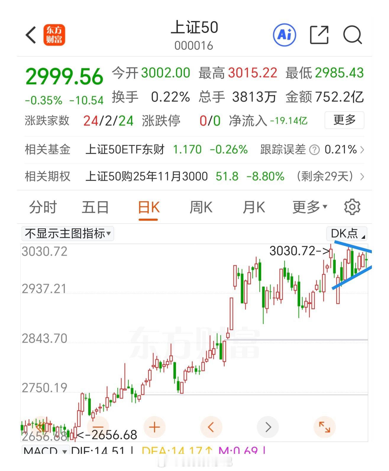 上证50指数连续两天探底回升了,主力肯定是在护盘的,早盘的十字星和昨天高低点都一样,形成了孕线,又到了三角形调整的夹角位置,看看多空双方谁能取胜吧!