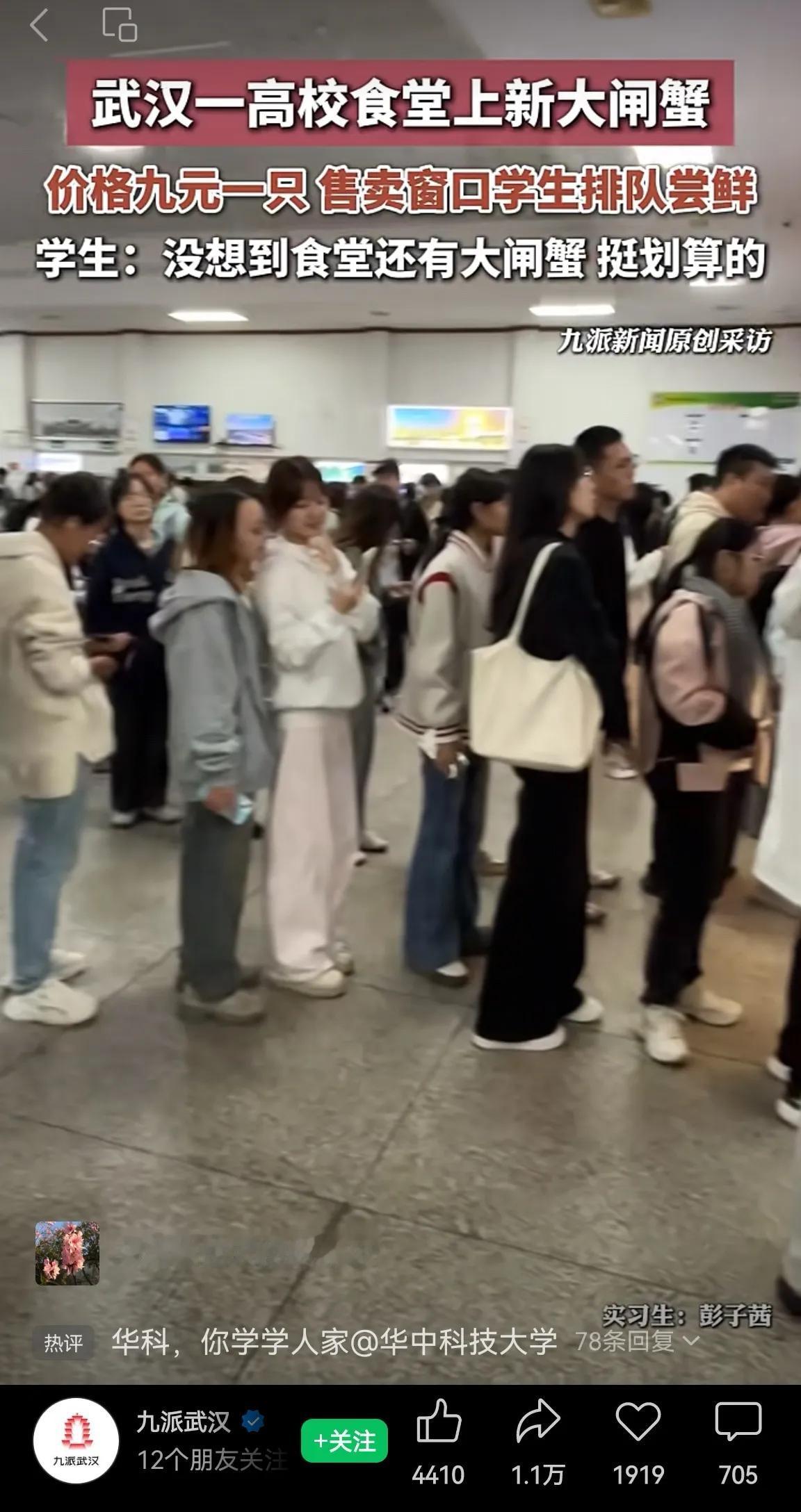武汉某重点大学食堂居然也卖大闸蟹了!九元一只,肥大唯美,引得同学们都来排队购买!您心动了吗?您能进来吃吗? 好像不行。这所大学是南湖之滨的中南民族大学,中南民大风景如画,食堂物美价廉,可惜目前还不能对外开放。大闸蟹价钱 大闸蟹店 大闸蟹批发价钱 武汉大闸蟹价格 芦苇湖大闸蟹 大闸蟹采购价格