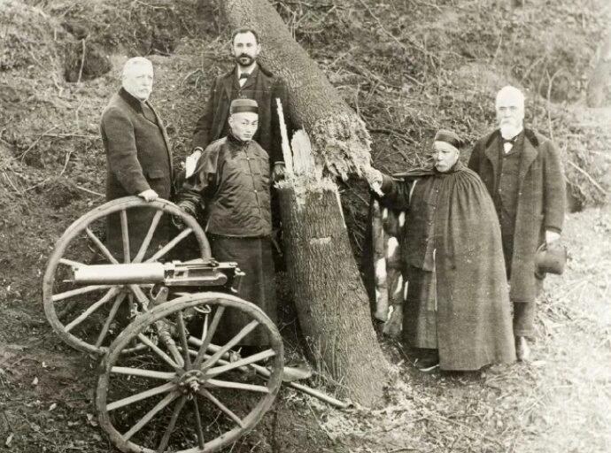 晚清时期的英国,英国人向清朝驻英公使龚照瑷展示马克沁机枪的震撼威力——仅仅半分钟,那棵环腰粗壮的大树便被无情射断,其破坏力在断裂的树干上展露无遗。 上方的英国人齐格蒙洛维身着西式长外套,而年轻的中国面孔龚心湛(龚照瑷侄子)则身着传统中式服装,与其他中外人士一同围绕着机枪与断树,或站或立。