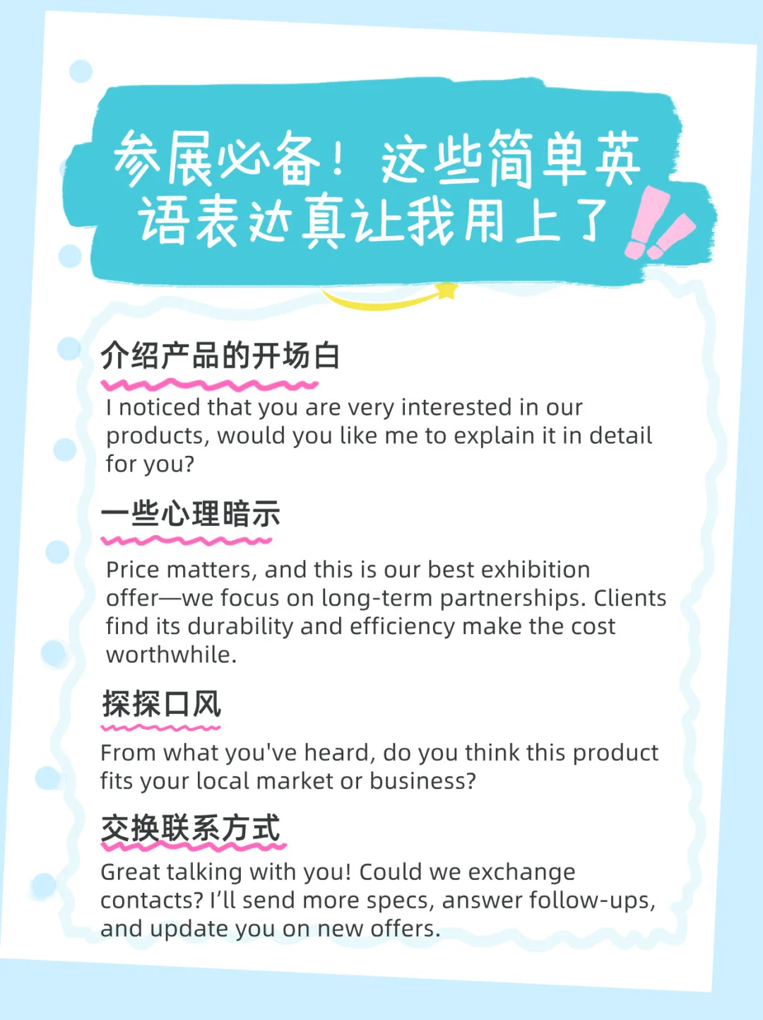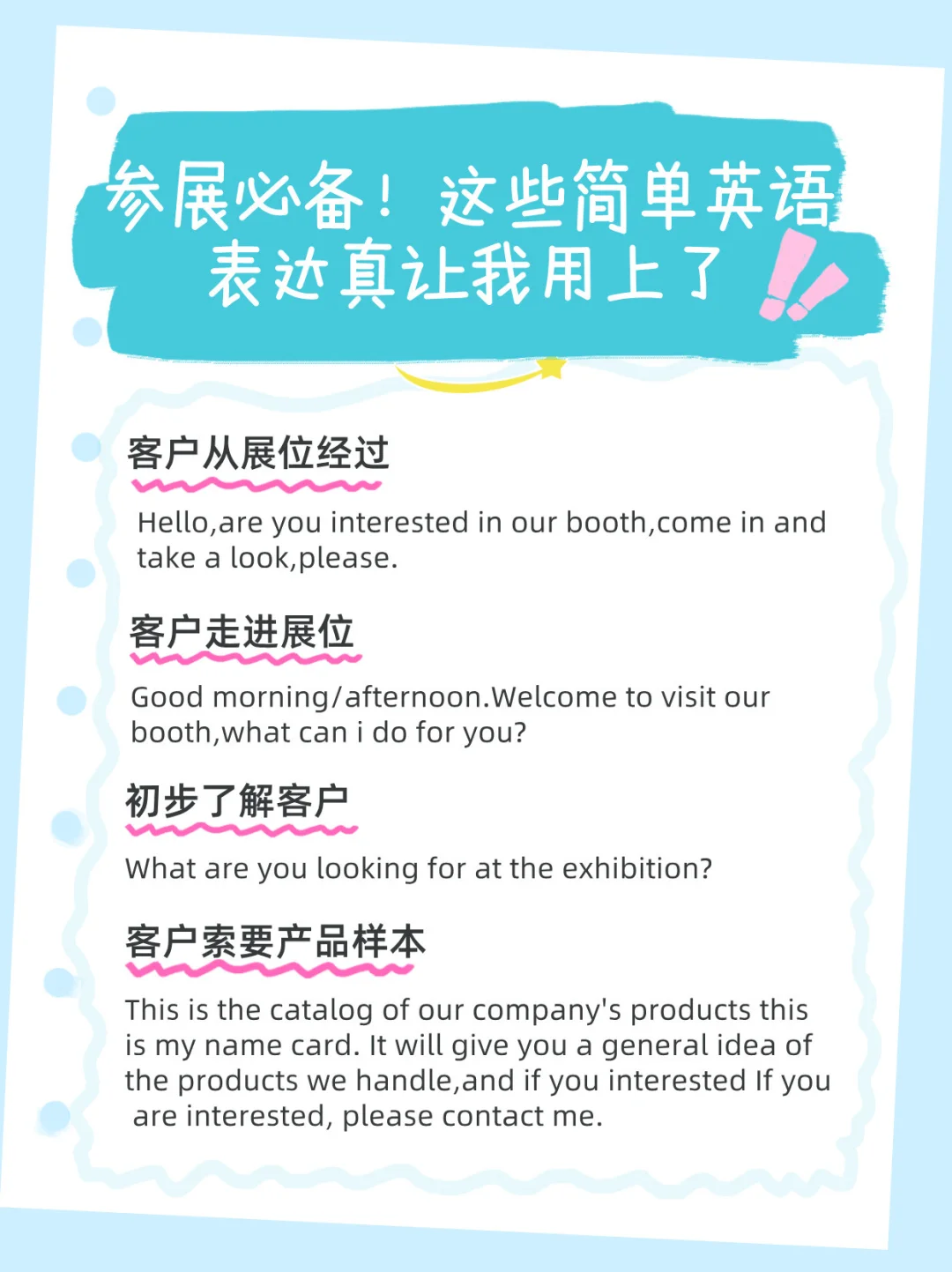 要参加展会怎么跟外国客户沟通? 如果你有这个担忧,极有可能是因为你还不知道做外贸的核心是:联系客户-客户下单-维护客户,英语只是工具,只要能拿单你就是外贸达人! 今天给大家整理了参展用的简单英语表达,赶快收藏起来去实操吧!每个情景掌握一两句即可,话不在多,够用就行!