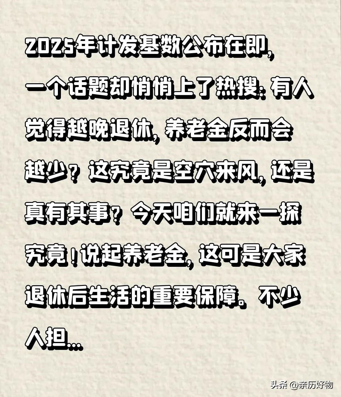 2025年计发基数公布在即,一个话题却悄悄上了热搜:有人觉得越晚退休,养老金反而会越少?这究竟是空穴来风,还是真有其事?今天咱们就来一探究竟! 说起养老金,这可是大家退休后生活的重要保障。不少人担心,随着退休年龄的推迟,自己能拿到的养老金会不会变少?其实,养老金的计算与计发基数、缴费年限、个人账户余额等多个因素有关。计发基数,简单来说,就是用来计算养老金的一个基准数值,它每年都会根据社会平均工资等因素进行调整。有人认为,越晚退休,虽然缴费年限可能更长,但计发基数可能因为经济环境等因素增长放缓,导致最终拿到的养老金反而减少。不过,专家指出,这种担忧其实大可不必。因为养老金制度在设计时,已经充分考虑了各种因素,确保大家能够享受到合理的养老保障。而且,随着经济的发展和社会的进步,计发基数整体上还是呈上升趋势的。 所以说,大家不必过分担心越晚退休养老金越少的问题。关于养老金,你还有什么想了解的?快来评论区留言,我们一起探讨!