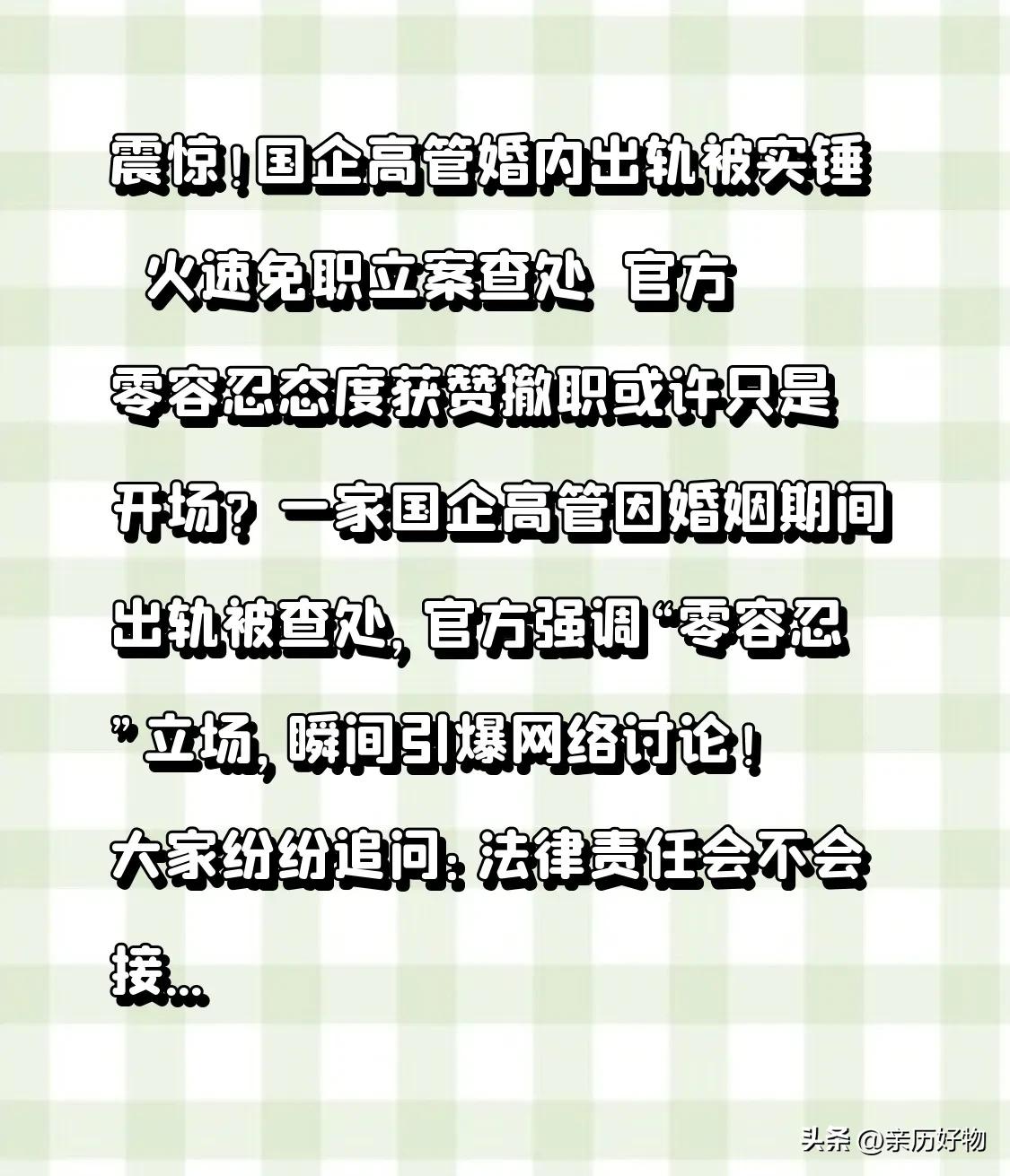 震惊!国企高管婚内出轨被实锤 火速免职立案查处 官方零容忍态度获赞 撤职