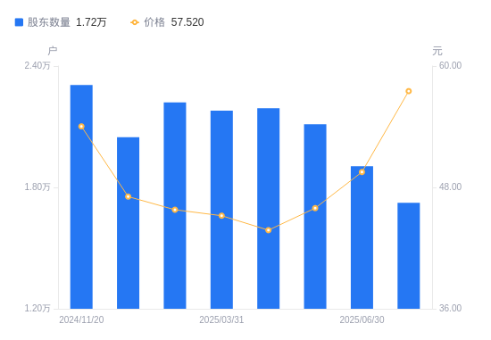 日期A股户数(户)流通A股户均持股数(股)户均持股市值(万元)2025-09-301723917786.82102.312025-06-301904416100.9779.732025-06-102112314516.2566.702025-04-182191413992.2861.252025-03-312179914066.0963.582025-02-282219713813.8863.262024-12-312048314954.0170.422024-11-202306613279.4071.752024-09-301325222949.61128.022024-06-301498920290.0981.76