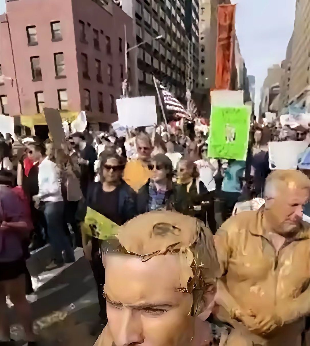 ​视频中,特朗普头戴王冠,驾驶大黄蜂战机,机身还写着“特朗普国王”,飞到抗议人群的头顶,朝人群中投下大坨大坨的大粪。抗议人群万万没有想到特朗普会来这么一手,毫无防备,许多人都被从天而降的大粪砸中,有的甚至被砸了一脸,连五官都分不出来了。