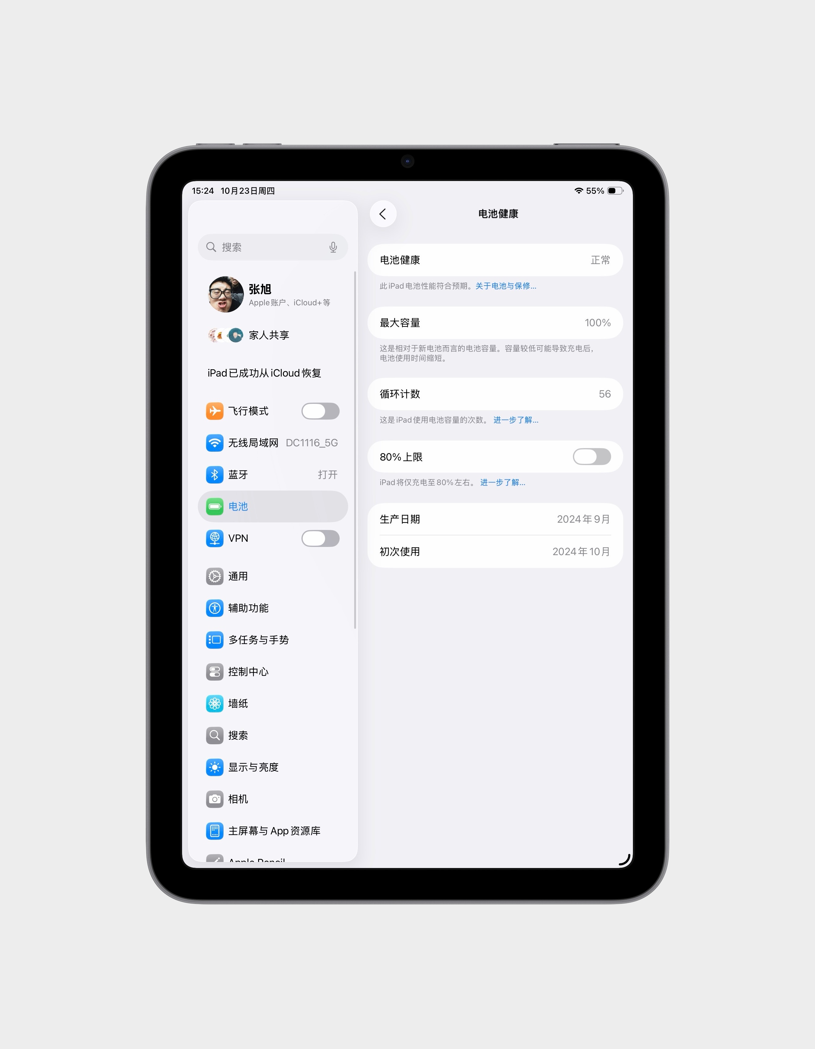 我看了一下,去年 10 月份买的,到今天正好一年。电池健康 100%,循环次数只有 56 次[允悲]