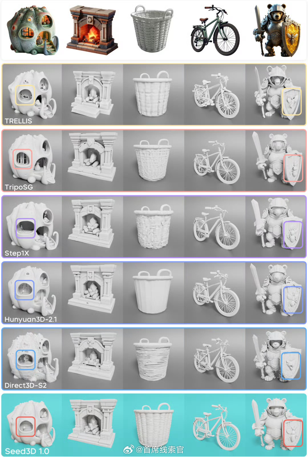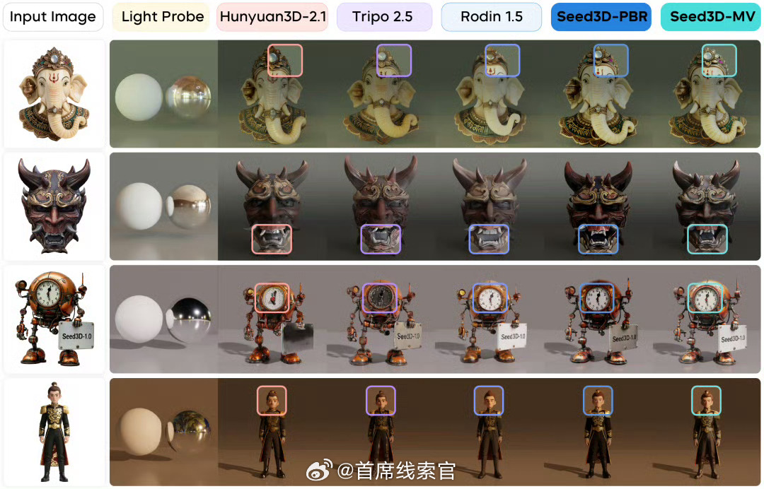 根据介绍,Seed3D 1.0 基于创新的 Diffusion Transformer 架构,通过大规模数据训练完成,可生成包括精细几何、真实纹理和基于物理渲染(PBR)材质的完整 3D 模型。