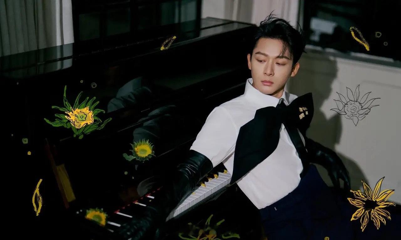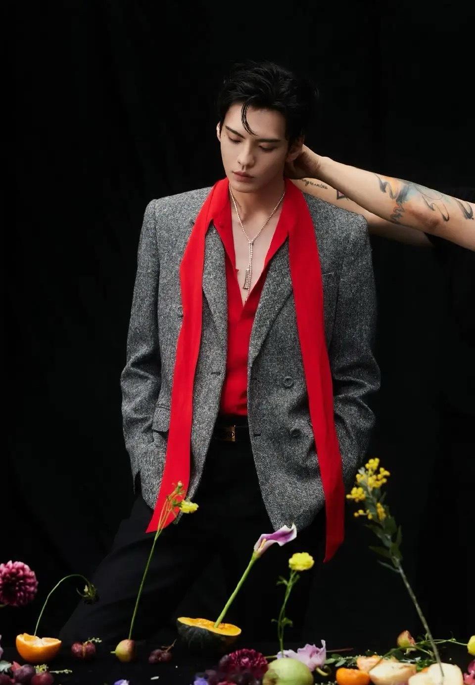 真少爷就是很贵气啊!曾舜晞暗绿色丝绒西装套装,整个人置身在长满鲜花的地方。