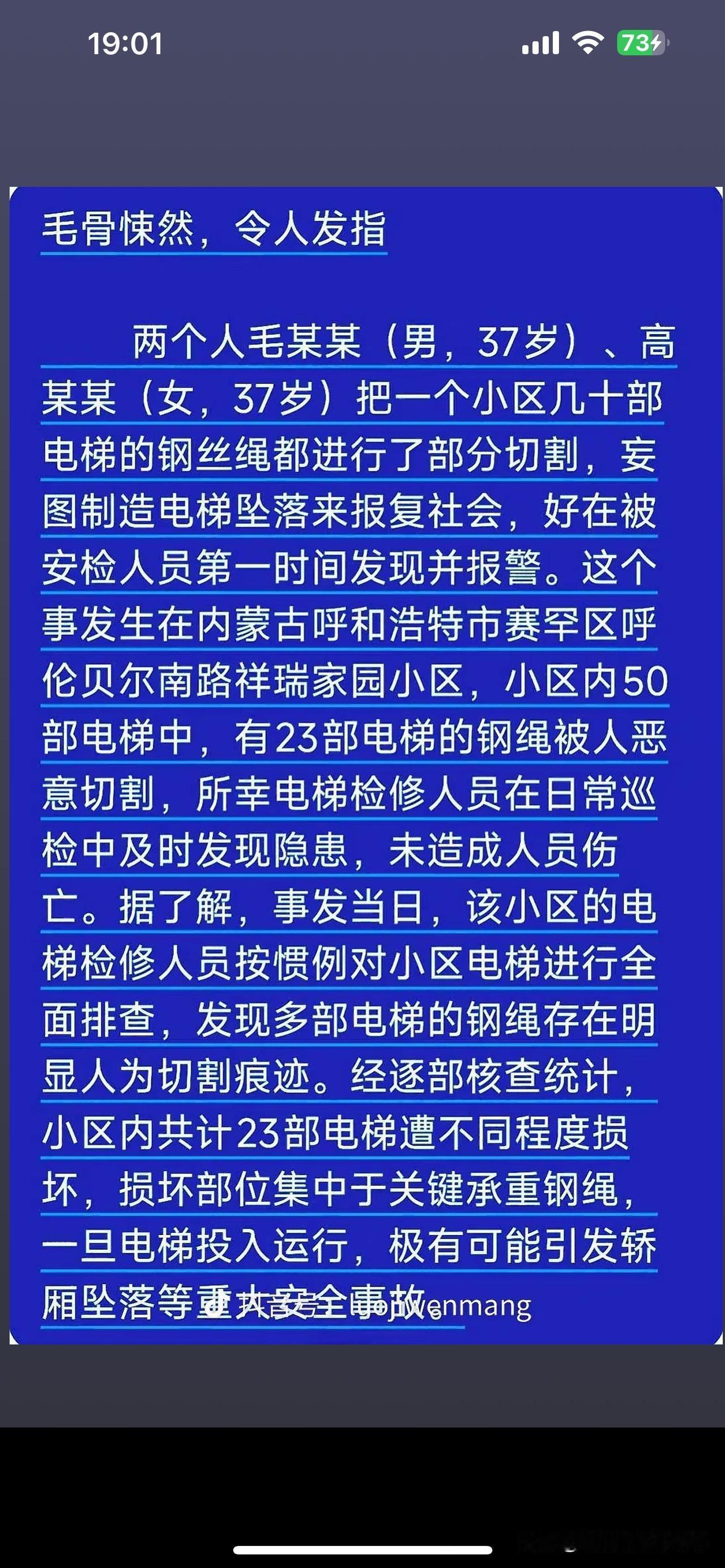 这真的太可怕了,小区共有五十部电梯,其中有二十三部电梯 被人恶意切割绳索,听到这个新闻真的是细思极恐,正常人谁会进入电梯井去破坏电梯,这是针对谁的呢,物业?还是小区,还是某家某户故意破坏?想想令人匪夷所思 怎么会有如此恶劣恶魔呢?这事就发生在内蒙古呼和浩特祥瑞小区二十三部电梯的钢绳恶意切割,电梯可是特种设备每一根钢绳都拴着人命,这是奔着要命去的,后果想也不敢想,万幸的是电梯修检员在日常发现了异常,立即停机上报,没有发生严重的坠落 目前警方已经找到嫌疑人,一男一女都37岁,案件正在进一步调查中,作案动机还没有公布,能干出这种缺德事来绝对不是一时冲动,这种行为极其恶劣拿着别人的生命在开玩笑,这两个人必须深挖严查,严惩不贷,同时给小区居民一个交代
