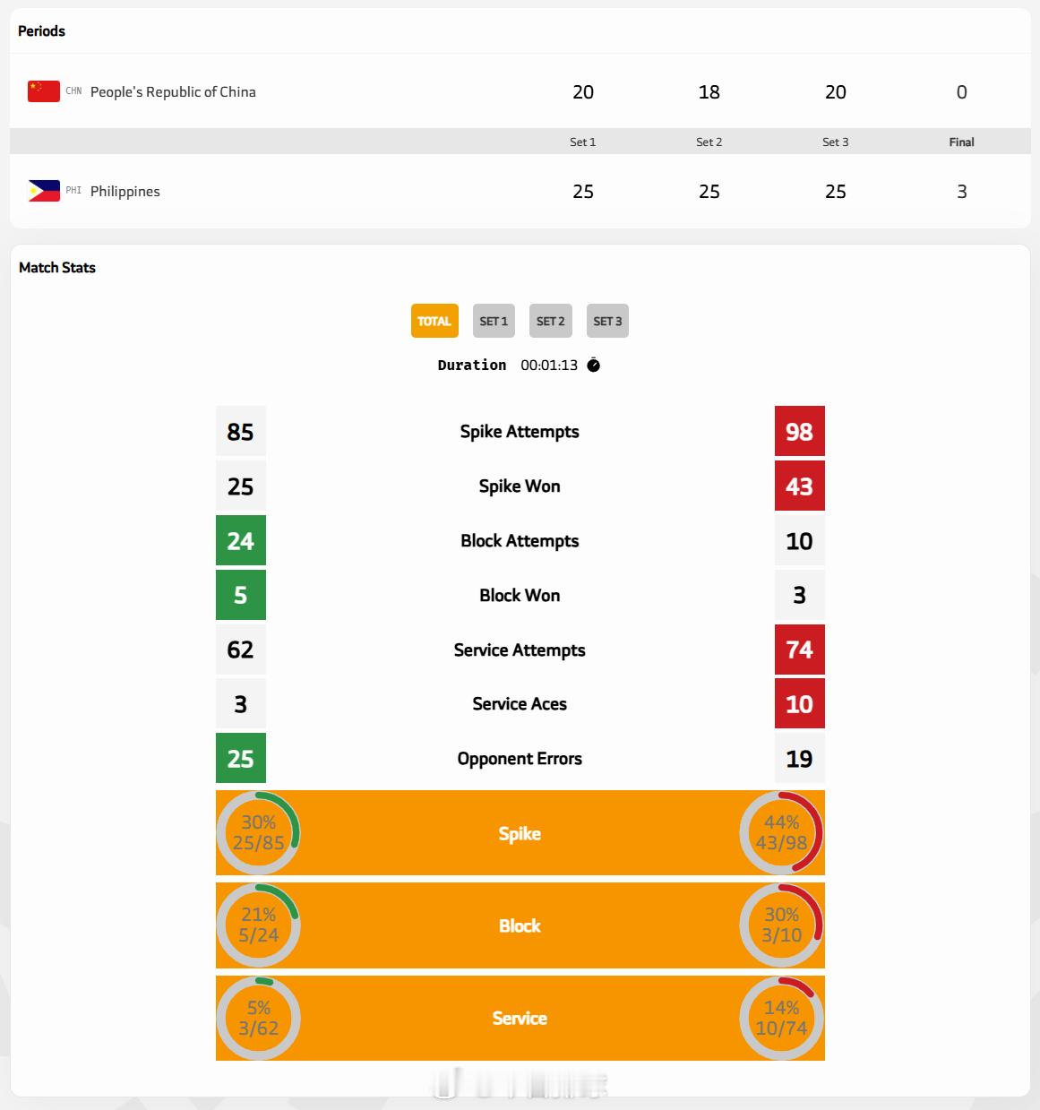 刚刚结束的比赛,2025年亚洲青年运动会 女排复赛第1轮,F组的中国队以0-3(20-25, 18-25, 20-25)不敌菲律宾队。排球微评 面对比自己队伍平均年龄高3岁的对手,中国队打得有板有眼,只是在力量和关键分把握上还欠火候。
